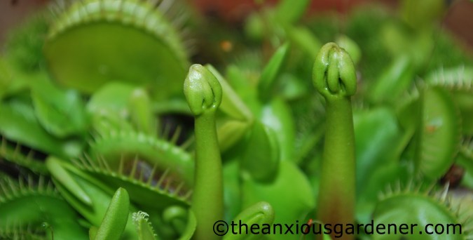 watering in the greenhouse, I saw that the Venus flytraps are pushing up their flower stalks.