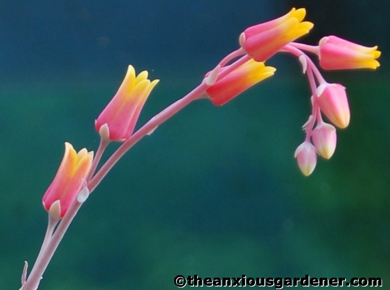 The flowers of Echeveria albicans. Looking good enough to eat – though they are probably horribly poisonous.