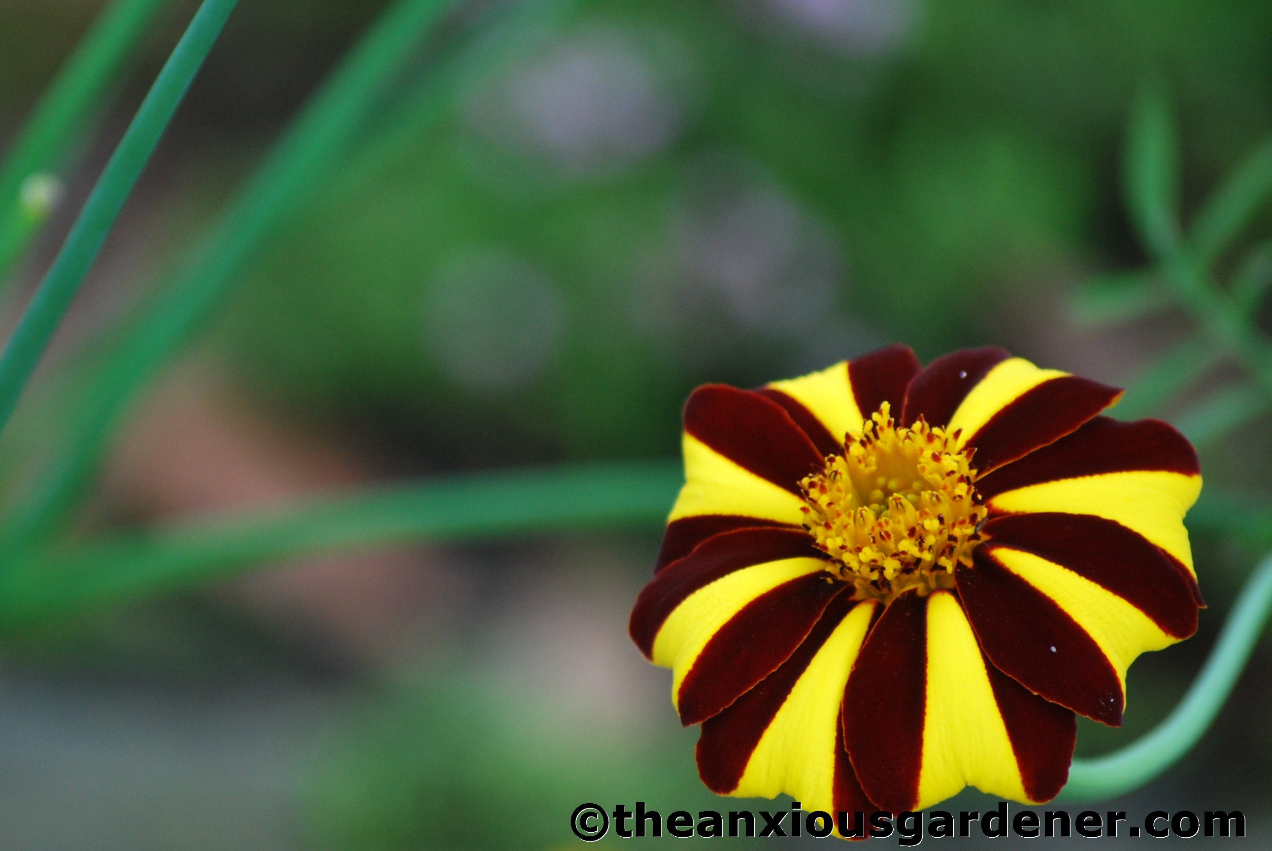 Now that is a glorious marigold-and I am not a lover of marigolds. At all. In fact, when a friend told me she was planting marigolds because they were supposed to deter aphids, I told her I’d pass on the flowers and continue to squish aphids. Because I dislike them both almost equally. 😉 I have to reconsider after seeing this stripy little number. Something about it reminds me of the uniforms of the Swiss Guards in Italy. A very nice marigold, indeed.