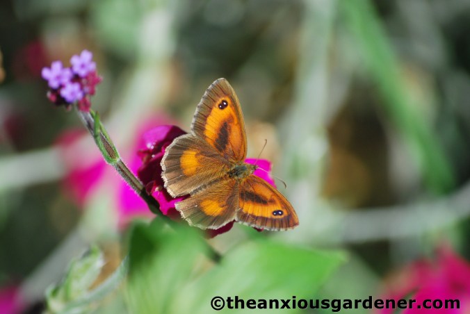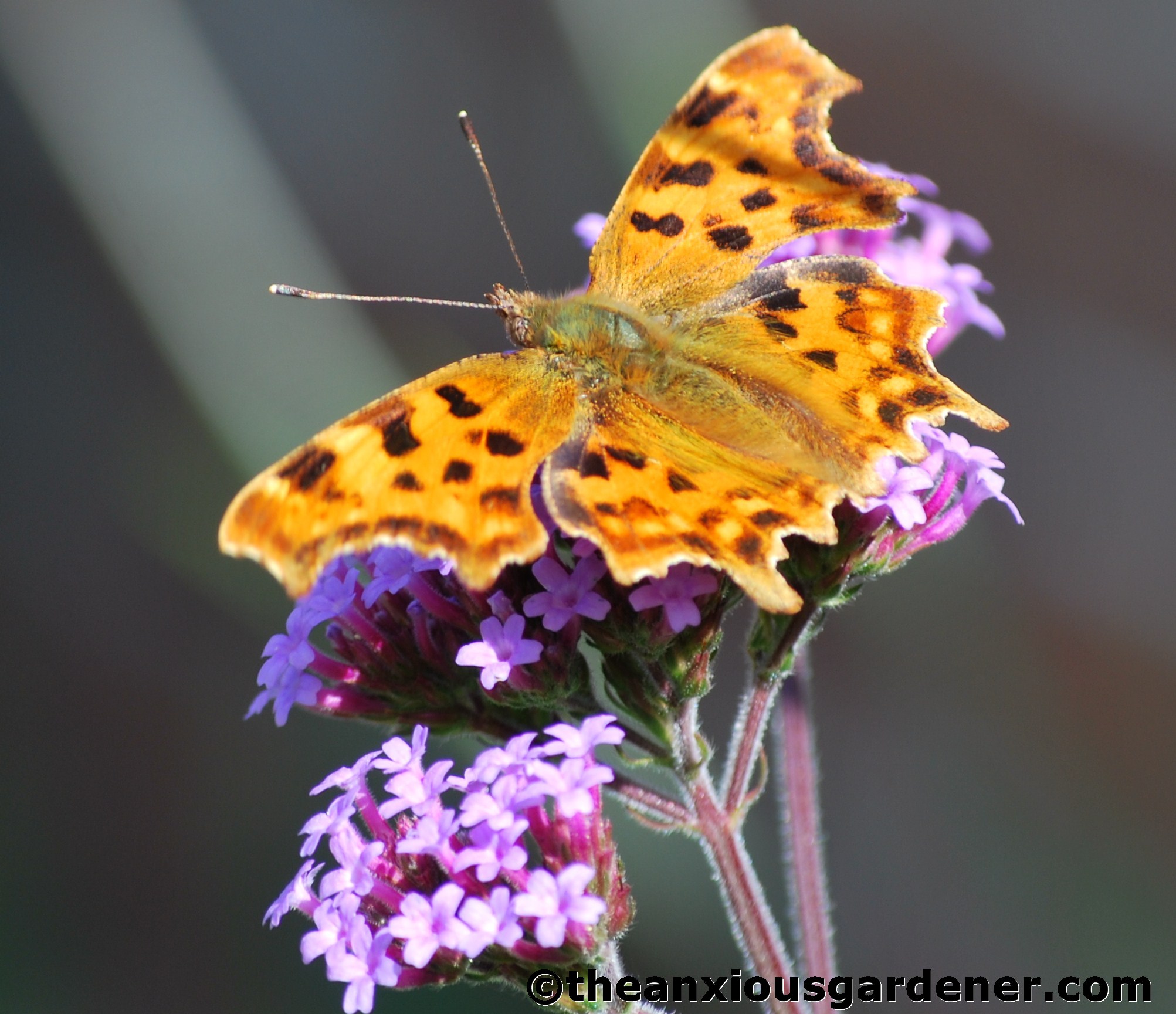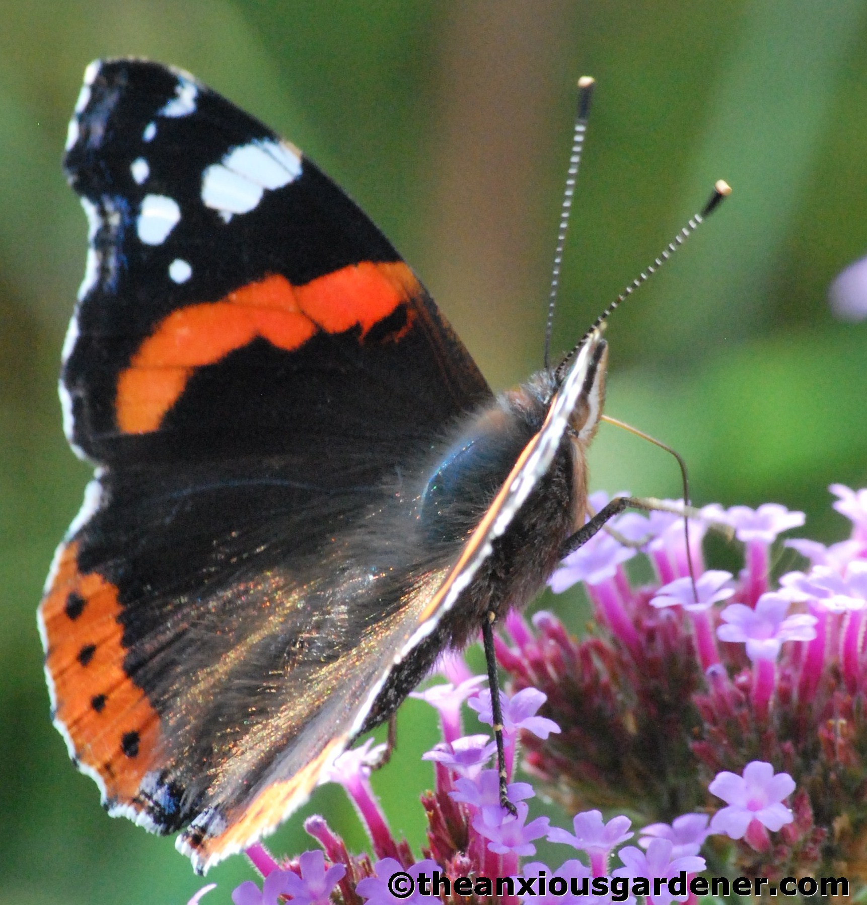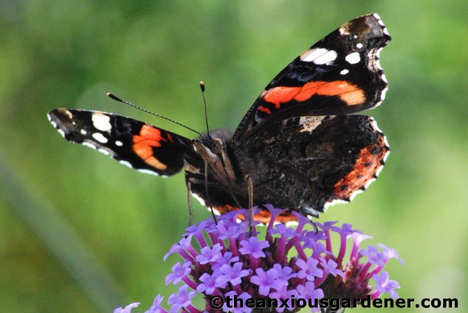 I think you could have a lot of fun with that first bed experimenting with different annuals each year to complement the box and acer. Or you could always plant some VB… I LOVE that second bed, the grasses work so well on the wild edge of the garden, and the elder gives great character. BTW, good use of butterfly pawn to justify the VB… I predict a MUCH larger tropical border next year…