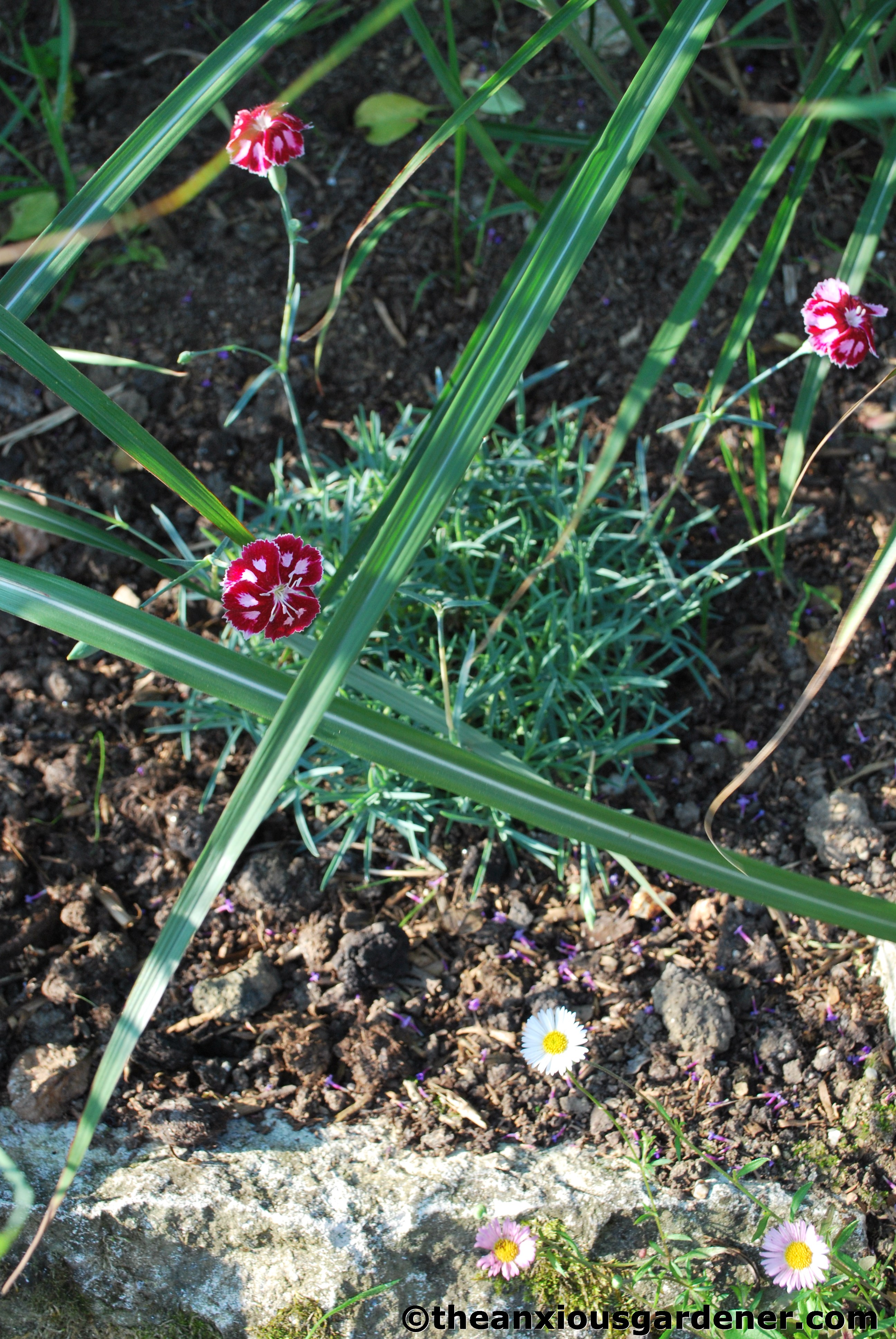 Along the rocks at the front I’ve planted some Erigeon karvinskianus (try saying that after a pint of sherry), and behind those Dianthus ‘Queen of Henri.’ I had the latter knocking about from when I worked in an alpine nursery. They’re as pretty as pretty can be and their scent is knock out. Probably the best plant scent in the history of the world. Probably.
