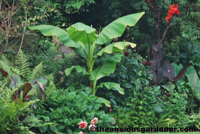Must have; they had Concorde and space travel. Anyway a banana (Musa basjoo), some cannas, some dahlias, a colocasia, a ginger lily (Hedychium gardnerianum) that didn’t flower and is only now emerging