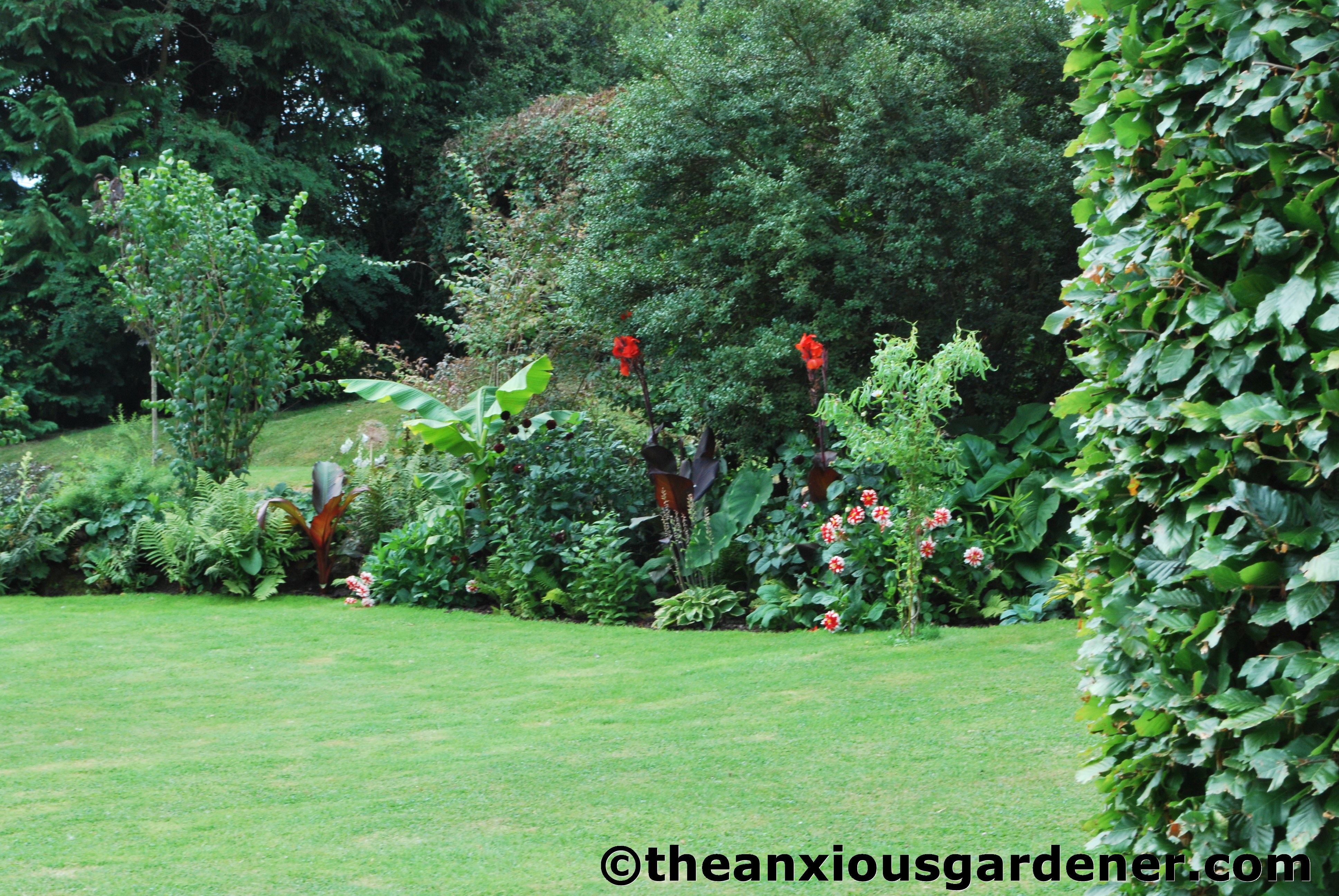 The new tropical border looks great, not too brash and bright, just right! Dahlias are making a grand come back, and Cannas never really disappeared, well almost, after the explosion of the canna virus in the UK from late nineties up to most of the noughties. Fortunately with wide spread awareness most infected stocks circulating were gradually destroyed and clean ones are widely available for sale (it was the other way around until recently). Cannas with dark, purple foliage are my favourite, as well as species ones. And you can't go wrong with bananas 🙂