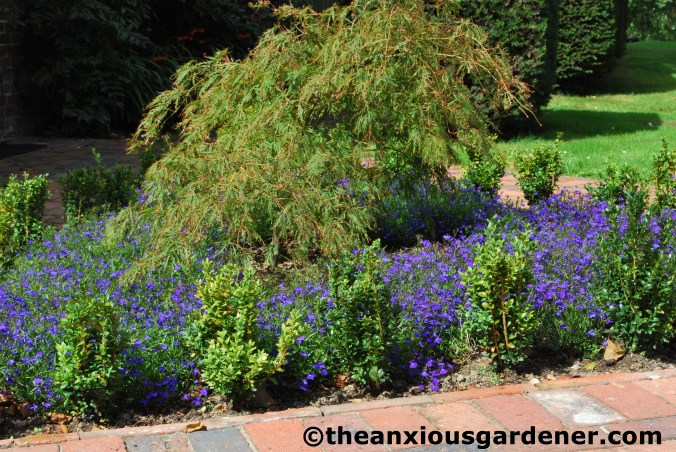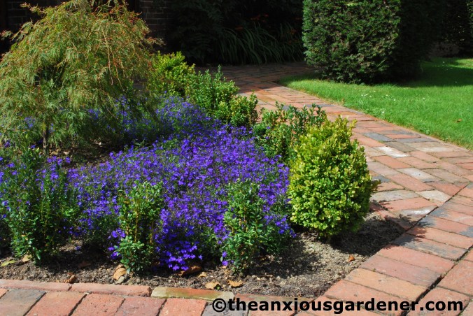 As a temporary fill-up within the box edging, I’ve planted dozens of Lobelia ‘Crystal Palace’ (buy one get one free – so saved a bit of cash there). I was going to sit down and plan some permanent planting but tell you what, though I’ve never been into summer bedding, I rather like this upright mat forming lobelia. Quite smitten with that blue. I shall think on …