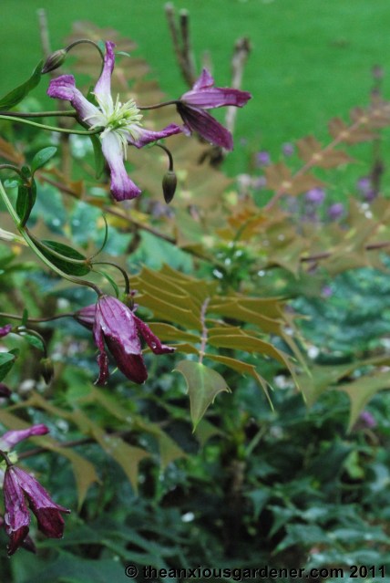 Oh bother, why have I just discovered a beautiful clematis that apparently would be happy scrambling up our ugly conifer. I can't take it with me, so I can't justify buying it, but it has been added to the list… I will ignore your lack of love for the mahonia, which I am rather a fan of – except when I need to prune it…