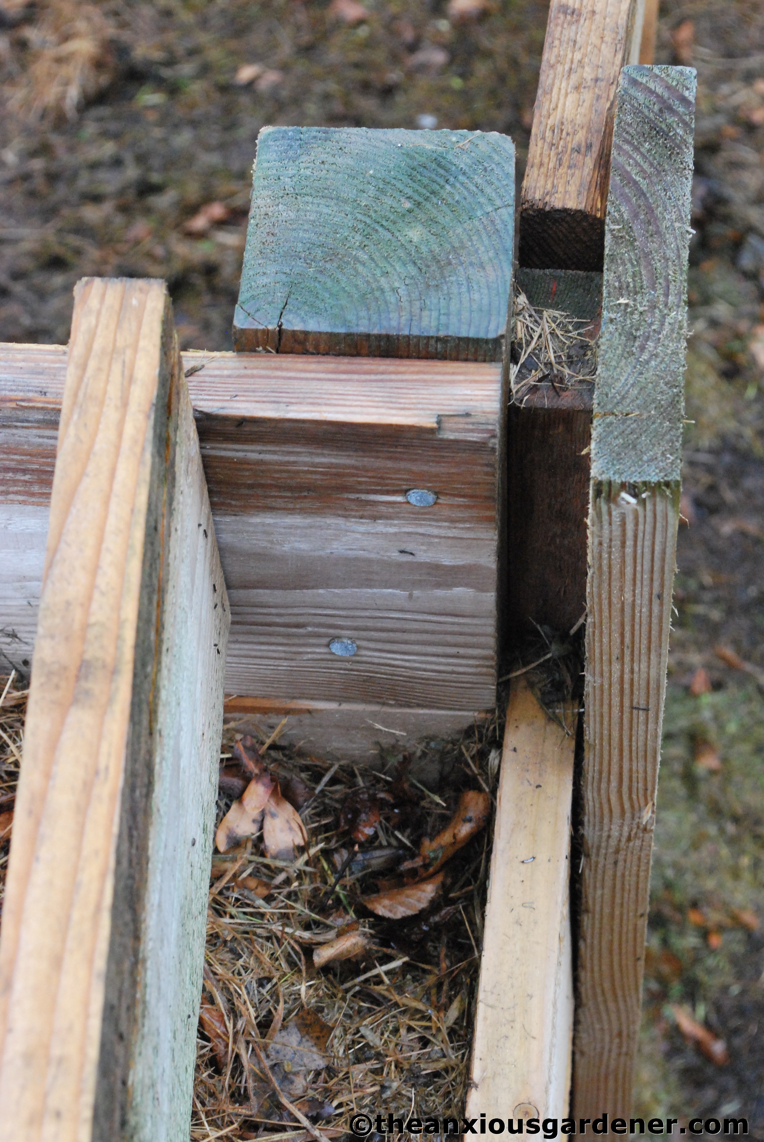 I planned to build two sets of three bins at the Priory and realised that if I spaced them correctly, I could have a seventh bin formed from the gap between the two.