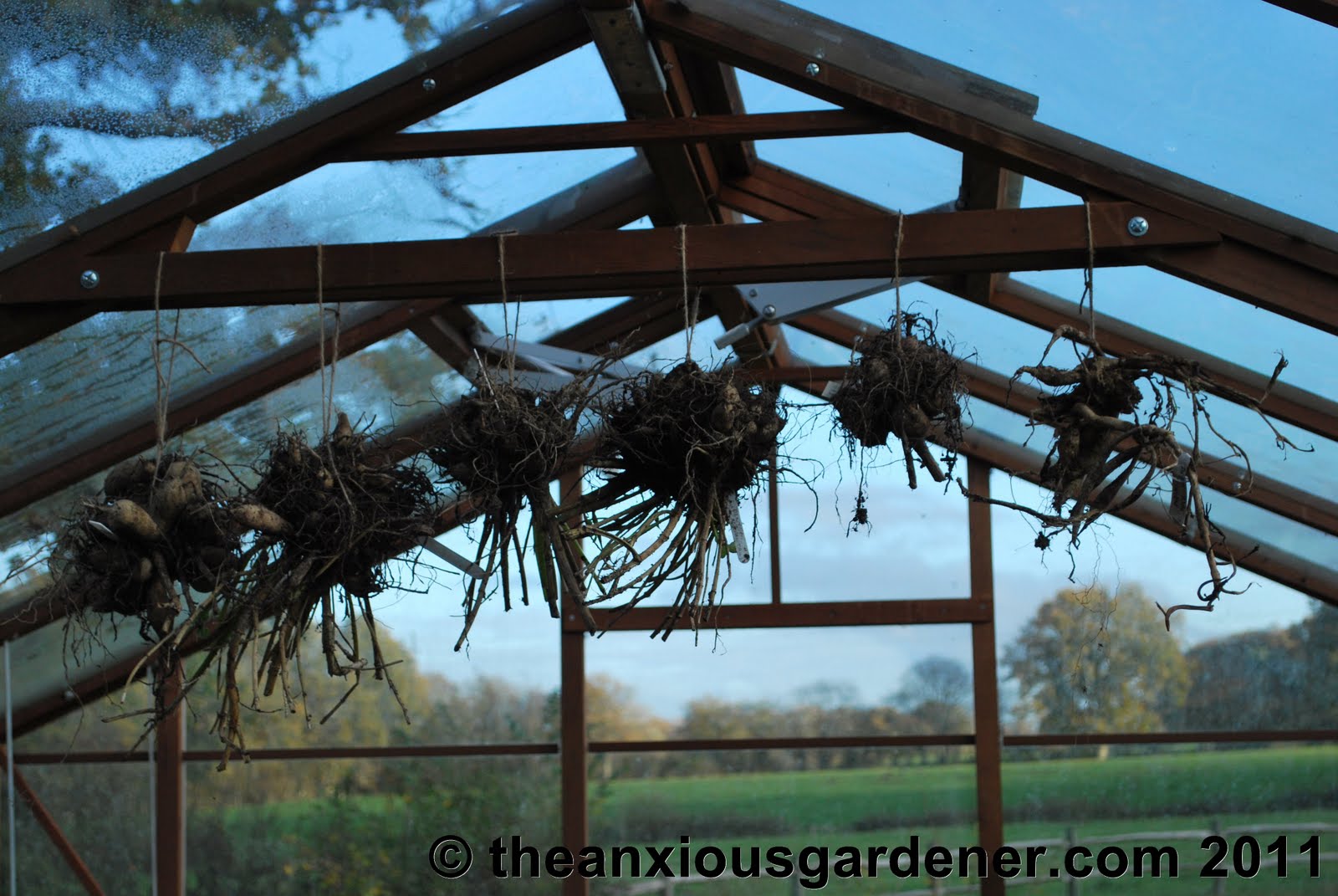 Oooh, that's neat. I wish I had some wooden beams to hang some tubers from. Of course, mine are still flowering, so I haven't managed to force myself to dig them up yet, but I don't think hanging them from the roof of an aluminium greenhouse will have quite the same effect… Which is a little David Lynch…