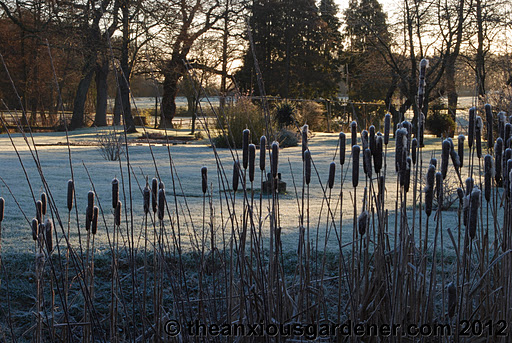 The reed mace has spread from the eastern side of the gardens and has now begun to colonise the west pond. I don’t suppose it should have such a prominent place in a posh garden but I rather like it. I like its shaggy, unkemptness. And the moorhens love it; fleeing to it for cover whenever I approach. It hasn’t been flattened by snow yet either which adds to its appeal.