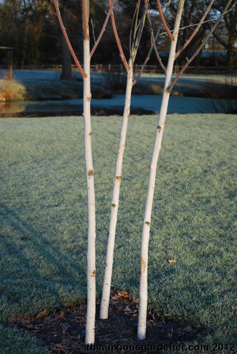 I planted this grouping of three Betula jacquemontii ‘Snow Queen’ in early 2009 and they’re doing pretty well. Once a year, in winter, I fetch a bucket of warm water* and a cloth and wipe down the stems to show off their striking white stems. I did have to explain to a recent visitor that no, I didn’t wash down the trunks of all the trees in the garden.