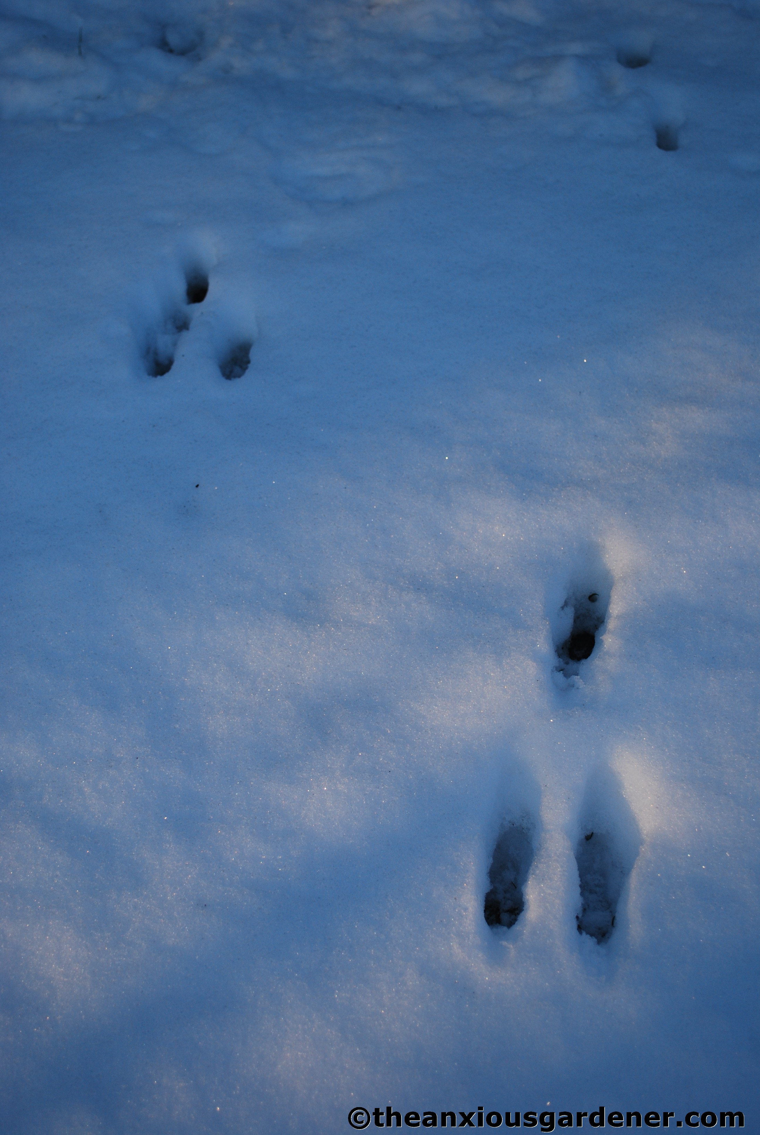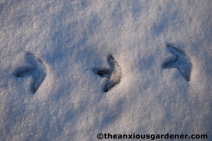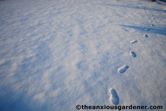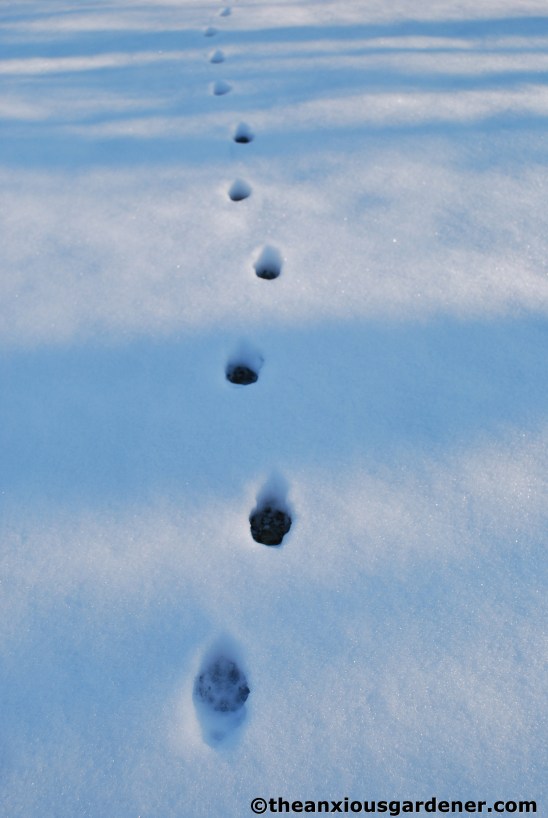 And this, this, (splutters with rage) is rabbit. I was able to follow the tracks to a small hole in the netting fence and block it off. Ha! (Just hope I didn’t fence it in, rather than fence it out).