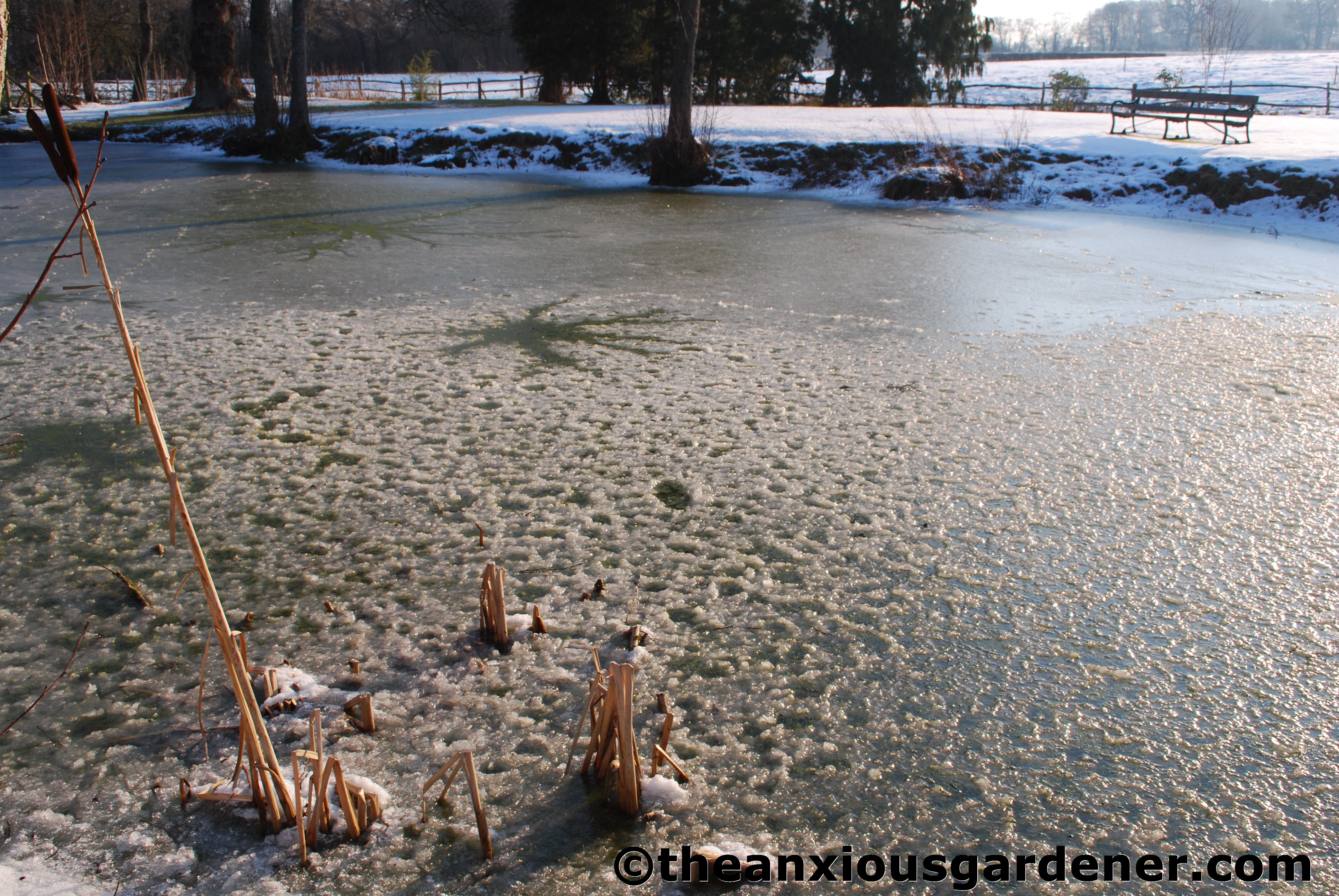 The east pond was partially frozen but, thank goodness, after the unfortunate incident when Solo (the stinky terrier) ventured out onto the ice (chasing a snowball), broke through it and had to be rescued by Jim wading out into the icy water (brrrr – so brave) she now stays firmly on solid ground.