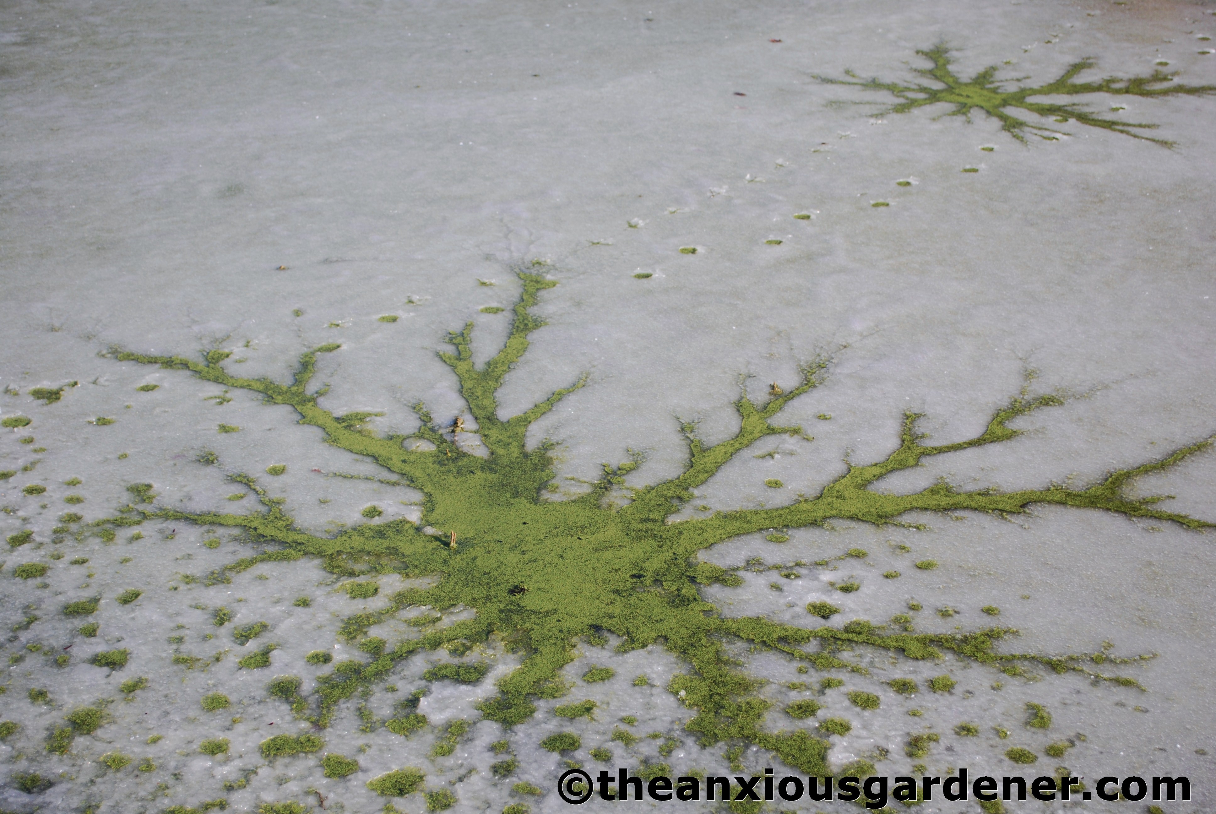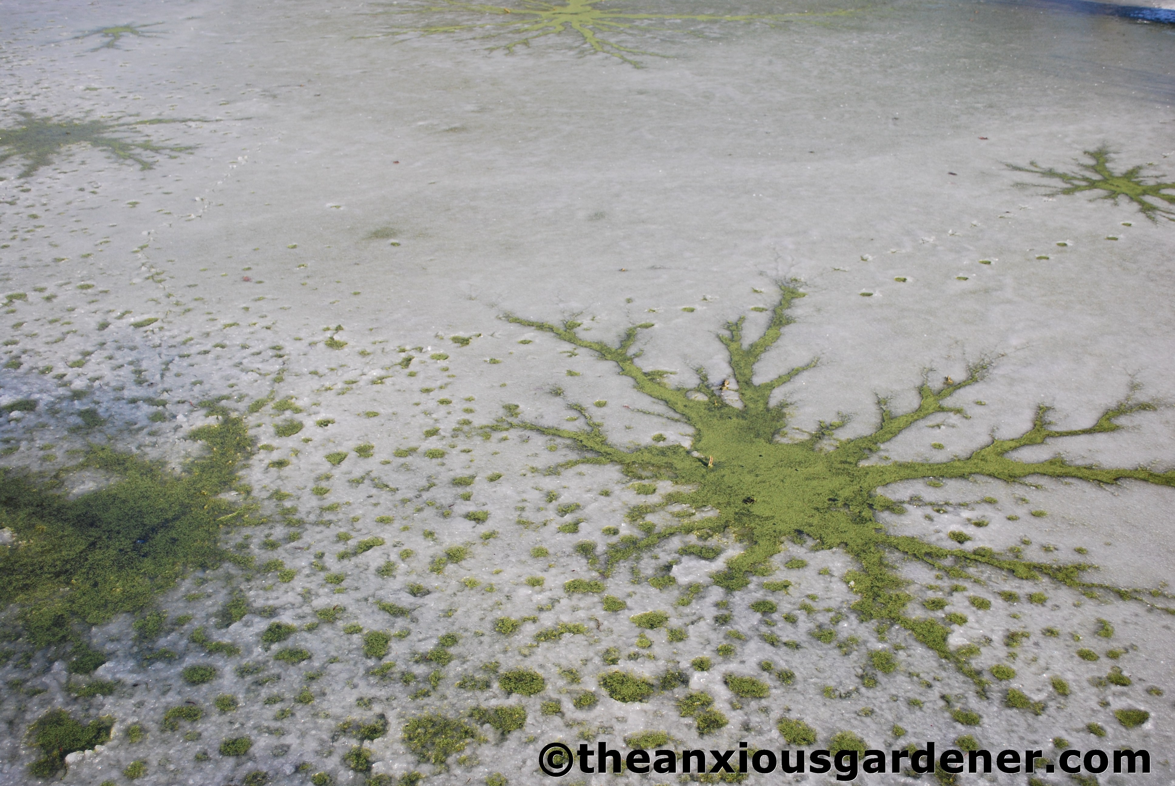 After posting this I saw some similar photos (sans duckweed) in a local mag with the explanation that they were caused by warm water dripping onto the ice, Not convinced – I blame the mallard!