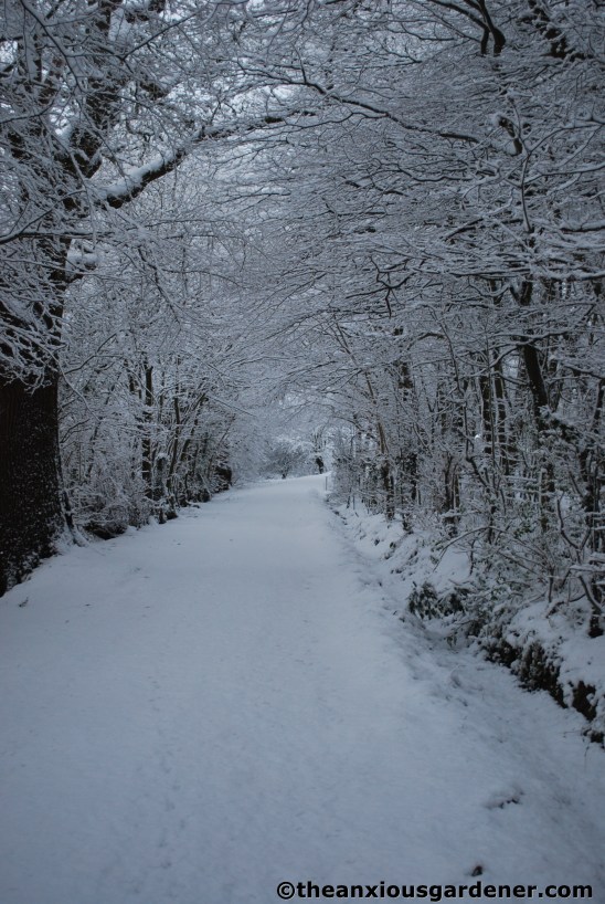 We didn’t get a huge amount in East Sussex; unlike in previous years. Several time last year, I had to leave my car up on the road and walk down to the Priory; only a 4×4 would manage to get back up the coruscating (!) incline from the house. It is a beautiful walk down the lane and virginal snow makes it even more so. Down through Margaret’s wood,