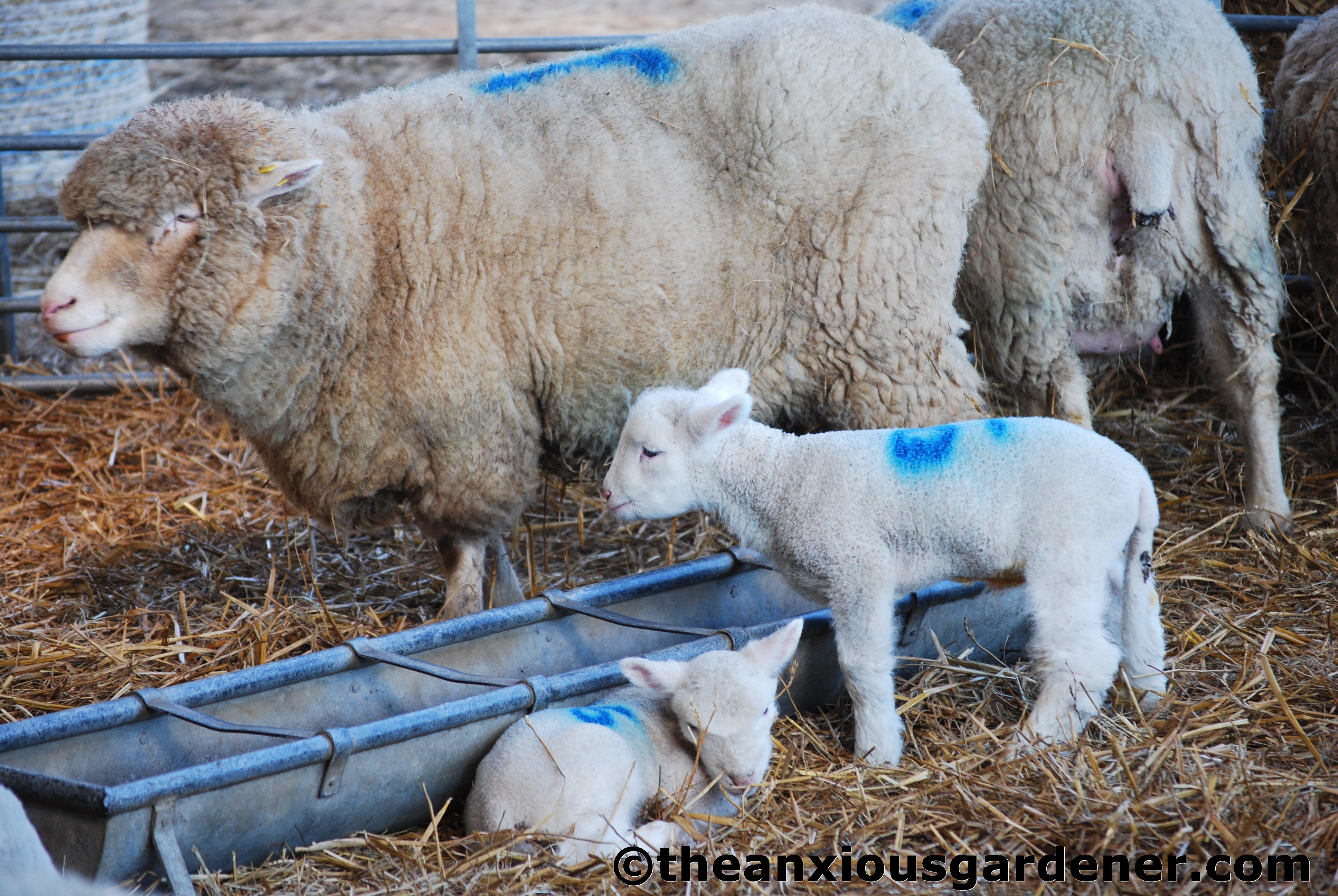 Last year I did a quick post of M’s spring lambs (see ‘ Gratuitous Lamb Photos’), only it was earlier in the year. This was because a visiting workman noticed that one of M’s sheep had got separated from a nearby small group. Obligingly he opened a gate to re-unite them. The lone sheep though was, of course, a ram and purposefully kept apart (much to his displeasure and frustration) from the eye-lash batting, coquettish ewes. The result? Some lambs born a month earlier than Margaret had planned. And a very self-satisfied, smug ram.