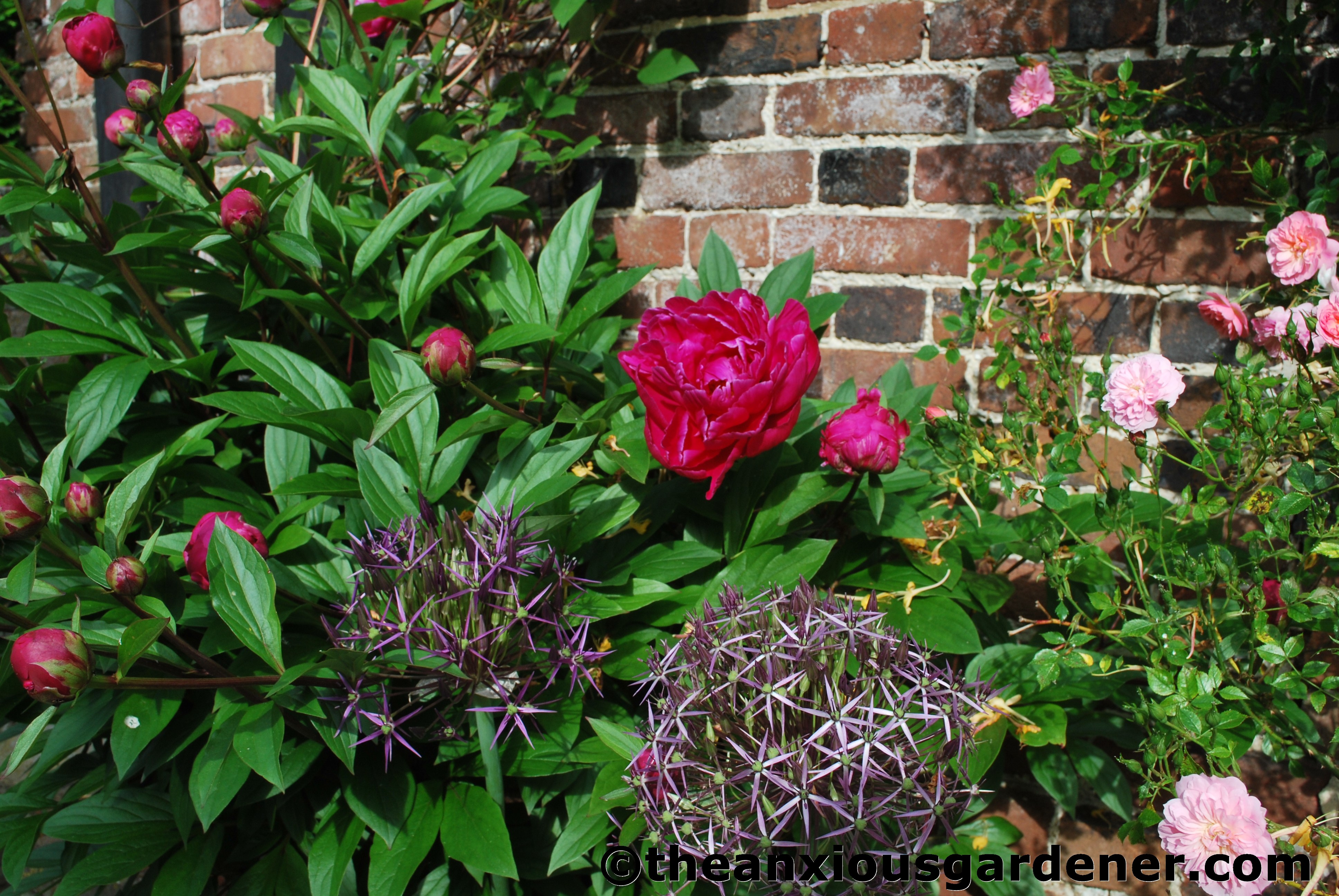 The one surviving tree peony flowered a week or so ago. Two out of the three original little trees died last year. They were old and had been strimmed (yep, true) in their poor blighted lives, so I’m quite surprised that they survived as long as they did. This one has a big blousy flower which is always welcome. But they last such a very short time (three or four days) that I shan’t be so very sad if this one gives up the ghost too.