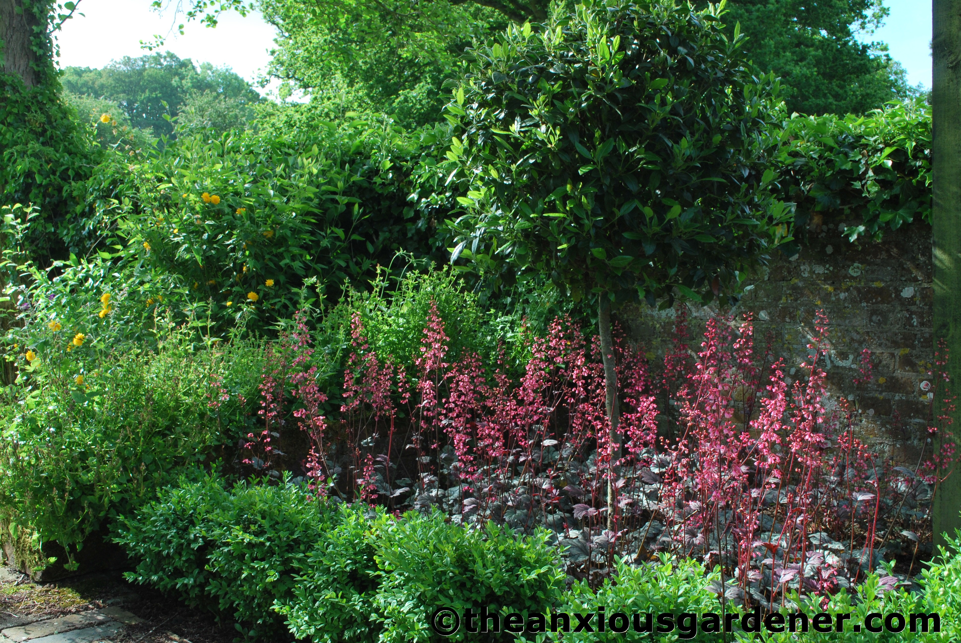 … heuchera in-fill. (A young Kerria japonica is to the left). The box hedge is new-ish and hasn’t yet been tightly clipped.