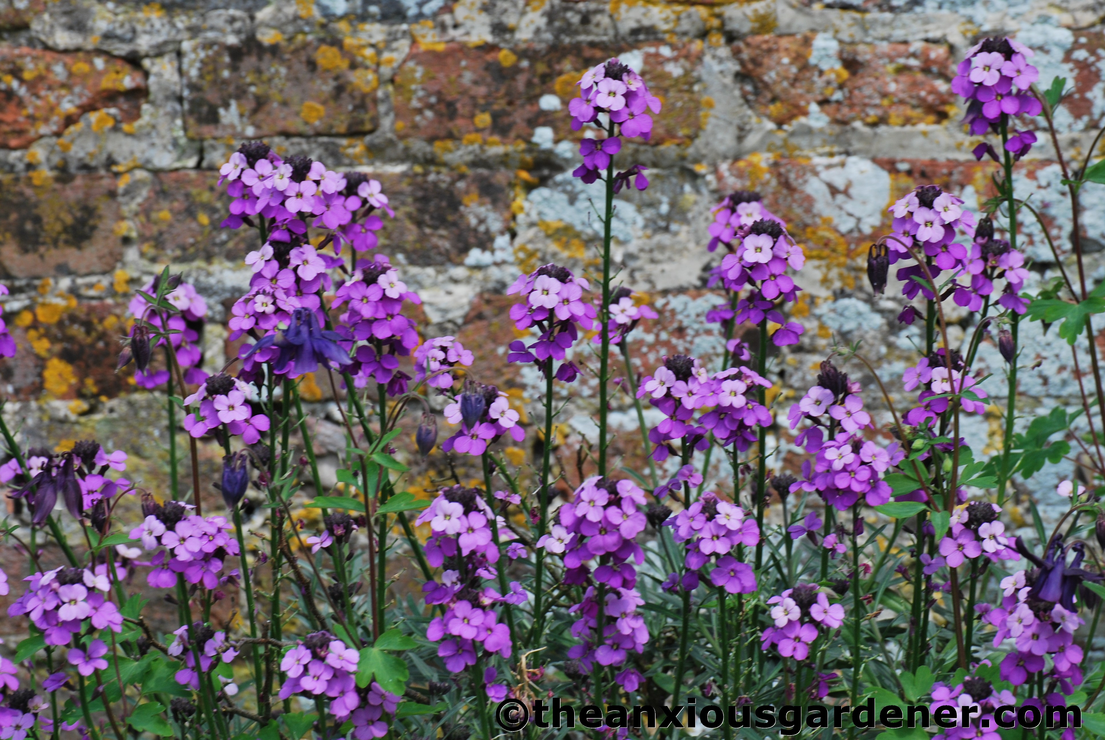 Erysimum ‘Bowles Mauve’ is a fine stalwart, flowering all summer long though not always surviving the winter. Luckily, cuttings take easily. Isn’t the lichen covered wall lovely? Least I think so.