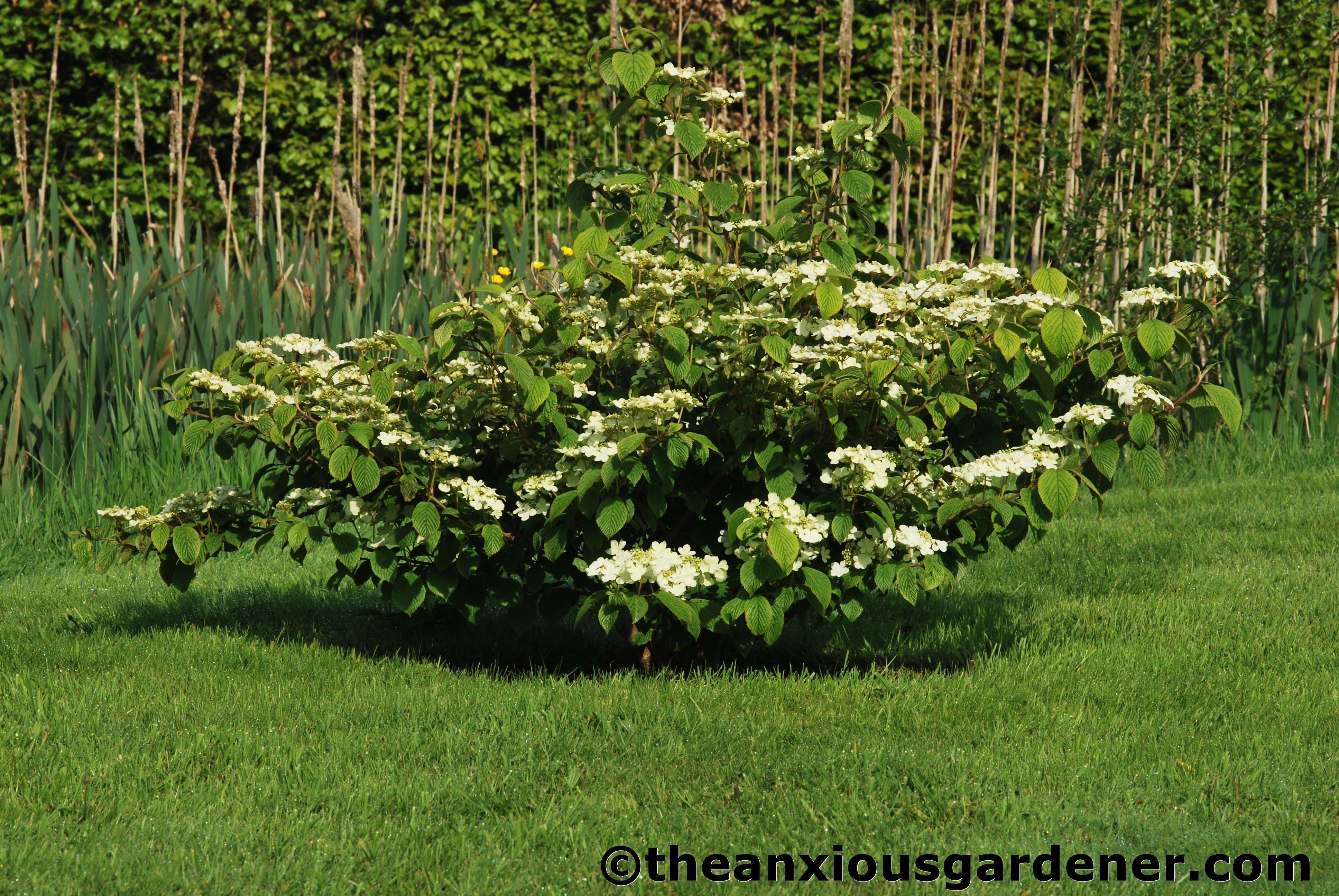 … Viburnum plicatum ‘Mariesii’. Three years ago, I put in a small plant on the west lawn by the pond. It has tripled in size and eventually, its many tiered form will be four metres across and ten feet high (bit of a metric and imperial mix there for you – I like to be even-handed). Can’t wait – at maturity they are a stunning spectacle.