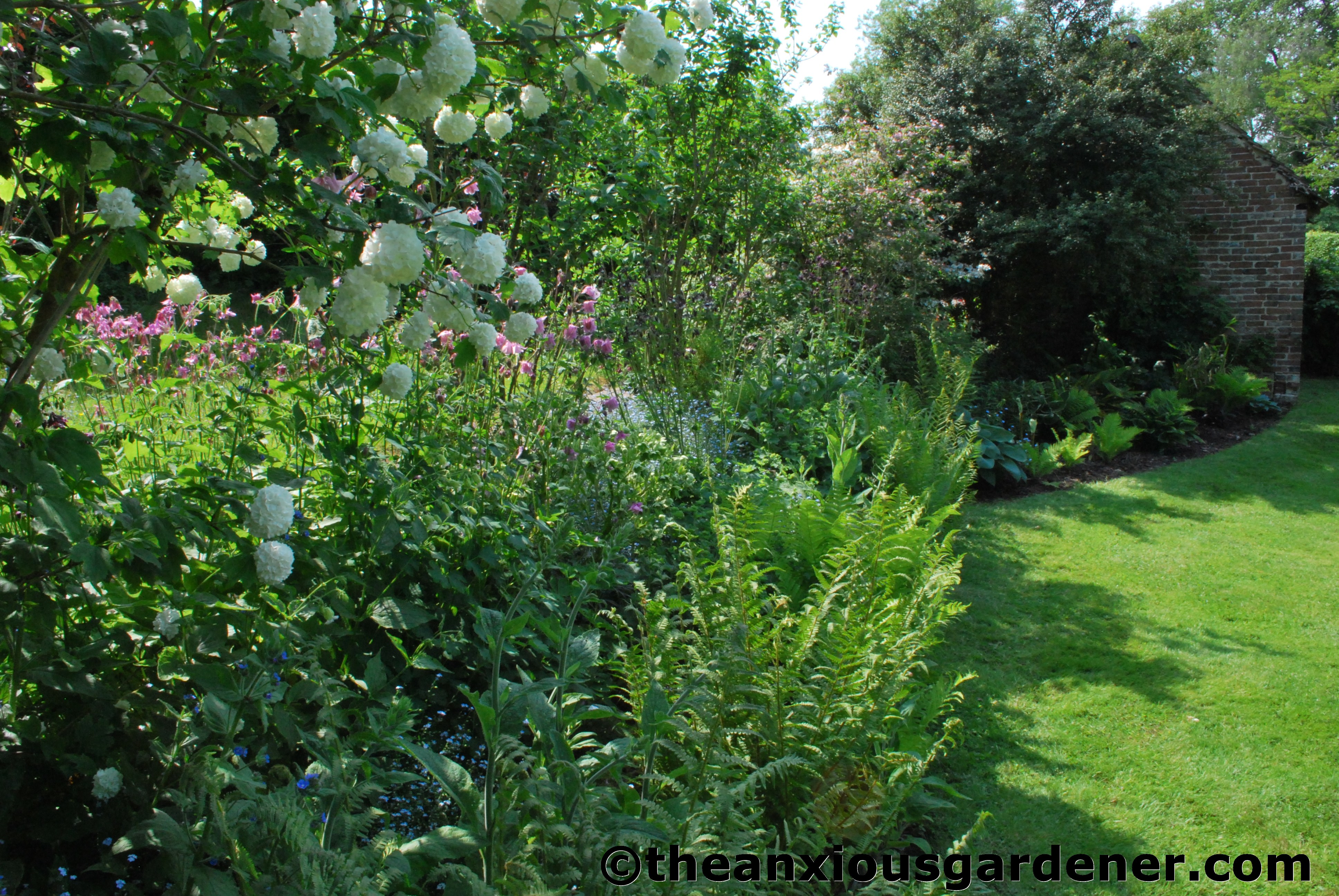 The rock border is plumping up nicely with Viburnum opulus ‘Roseum’ in flower (top left) and …