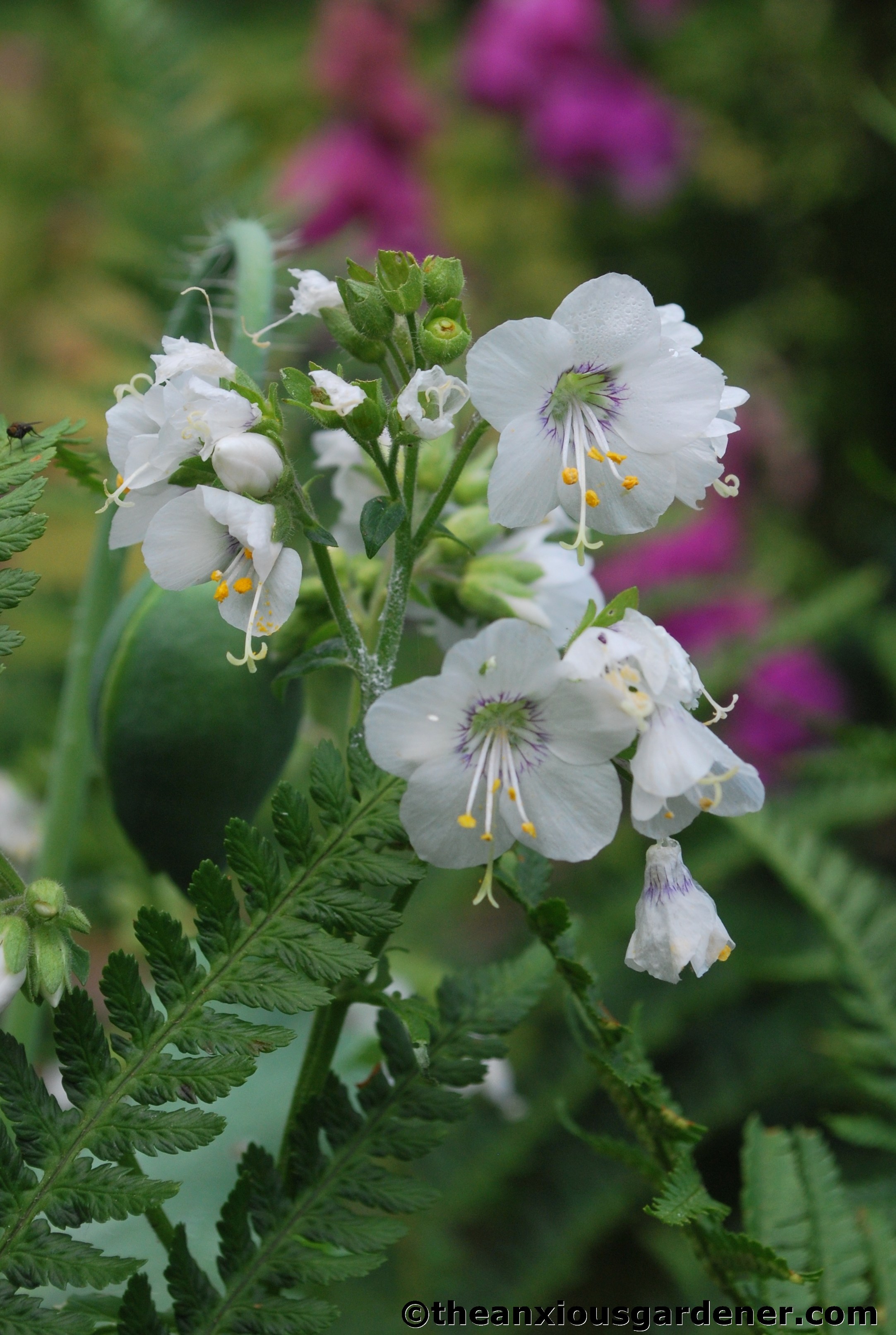 Also in the rock border, amongst the ferns, I’ve discovered polemoniums. Never seen it before; never grown it; never bought any seed. Its seed must have lain dormant in the soil. Waiting. Just waiting. Either that or there’s a guerilla gardener about!