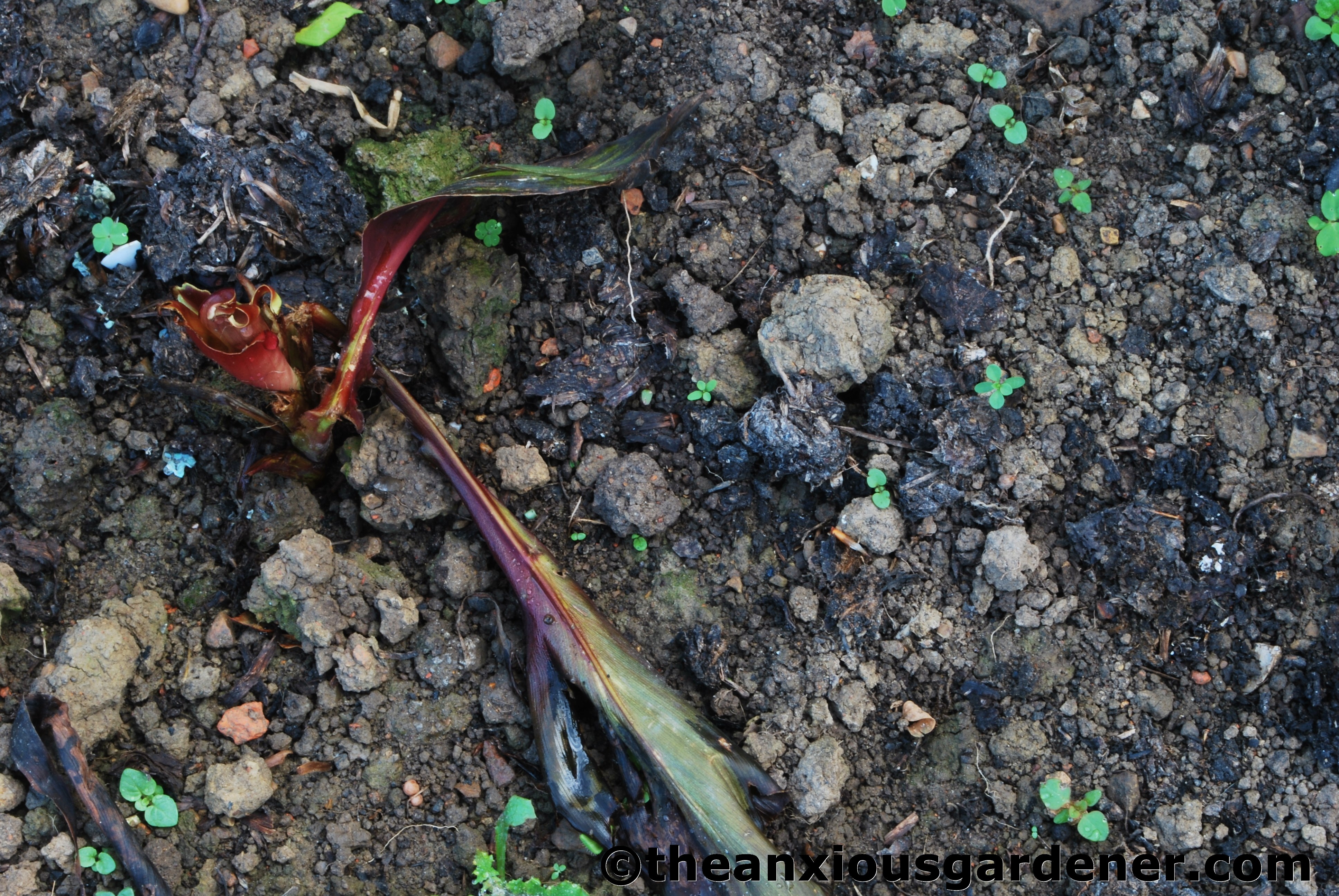 This was the bergenia de-frocked in April; looks a little startling but the new, fresh leaves soon emerge.