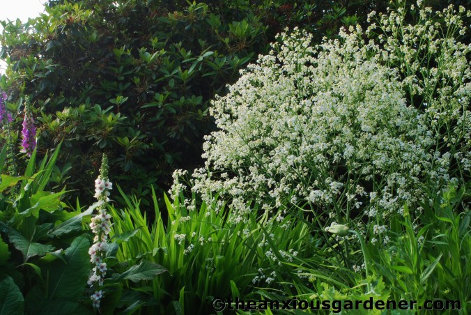 In one of the kidney beds, my Crambe cordifoila has flowered again. Last year the stems collapsed, so this year I’ve given it a damn good staking – and it is holding up. Oddly, the slugs don’t seem to bother it.