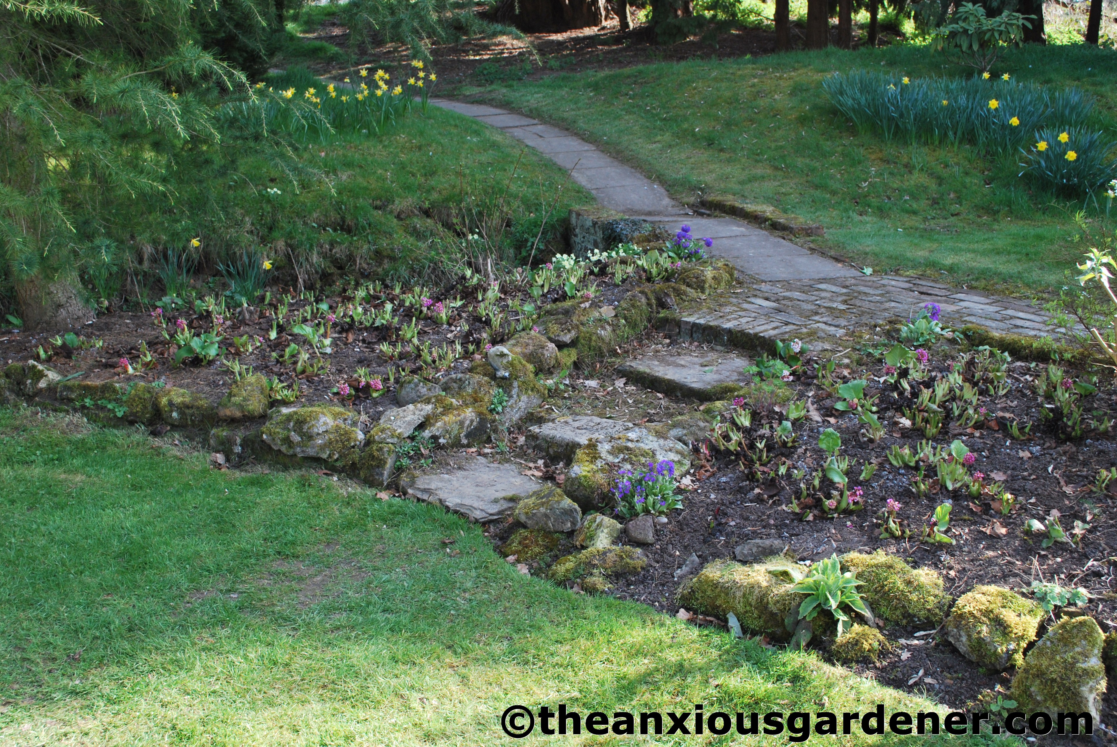 At the rock border’s far end, and increasing year on year, is a clump of yellow loosestrife (Lysimachia punctata). To the left of it is bergenia – which I moved here from another part of the garden. Incidentally, I always cut off all the bergenia leaves in spring; this removes all the tatty, browned ones.