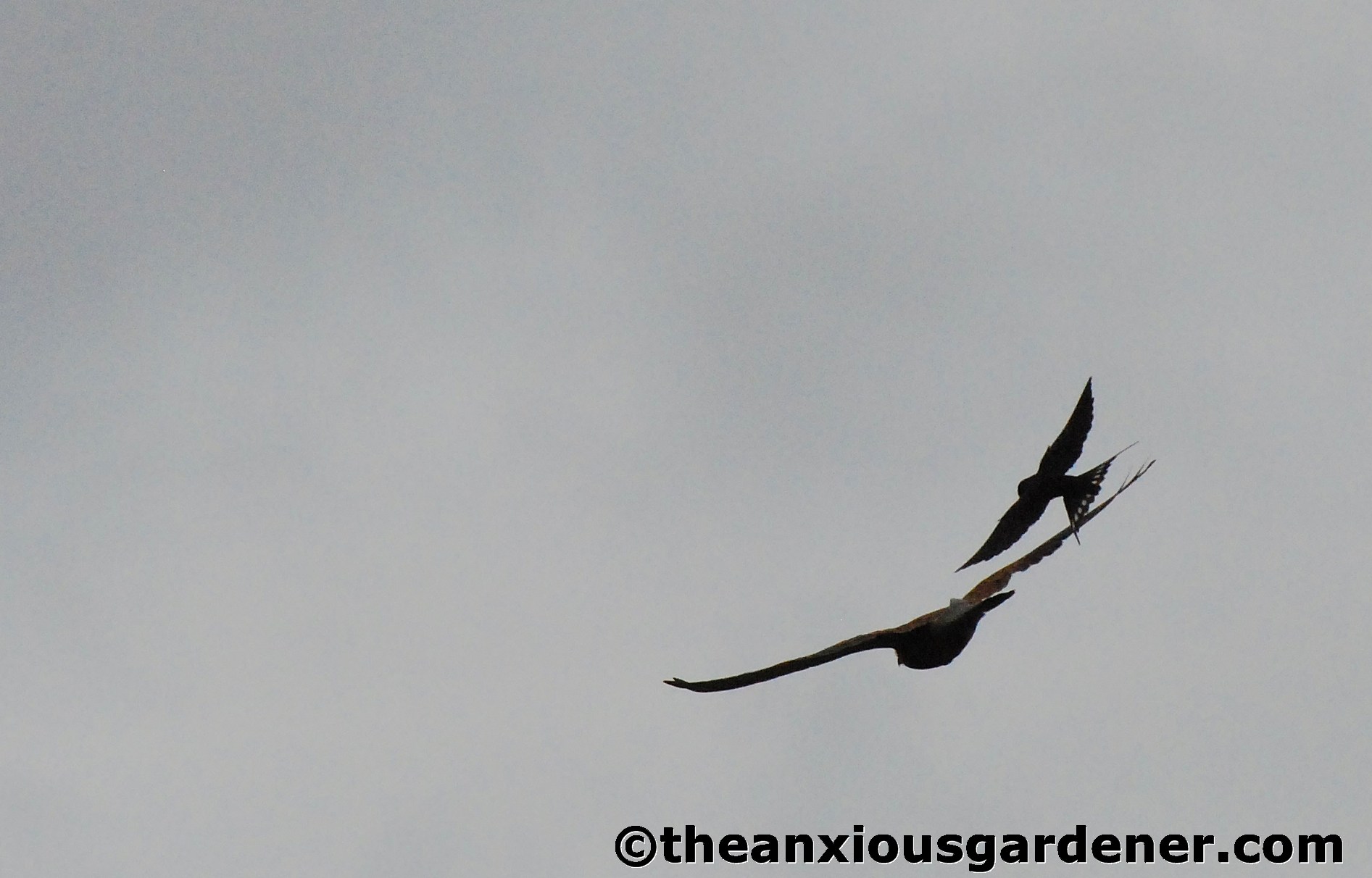 Yeah, he just sat on the roof looking imperiously down at me. Posing. If I looked like that, I’d do the same. He seemed supremely unconcerned by the dive bombing of the swallows. I think I saw him flinch once. I guess mobbing does drive hawks away – I’ve seen buzzards withdraw after being hassled by crows. But then crows dive-bombing me would drive me off. And I suppose a mobbed kestrel (even one mobbed by swallows) might drop its prey. Perhaps. Dave