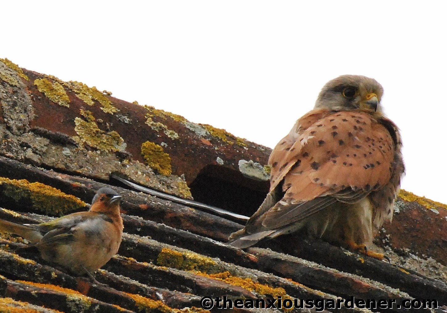 Later, when the kestrel had returned to his vantage point on the roof, I watched a fearless chaffinch also have a go at him.