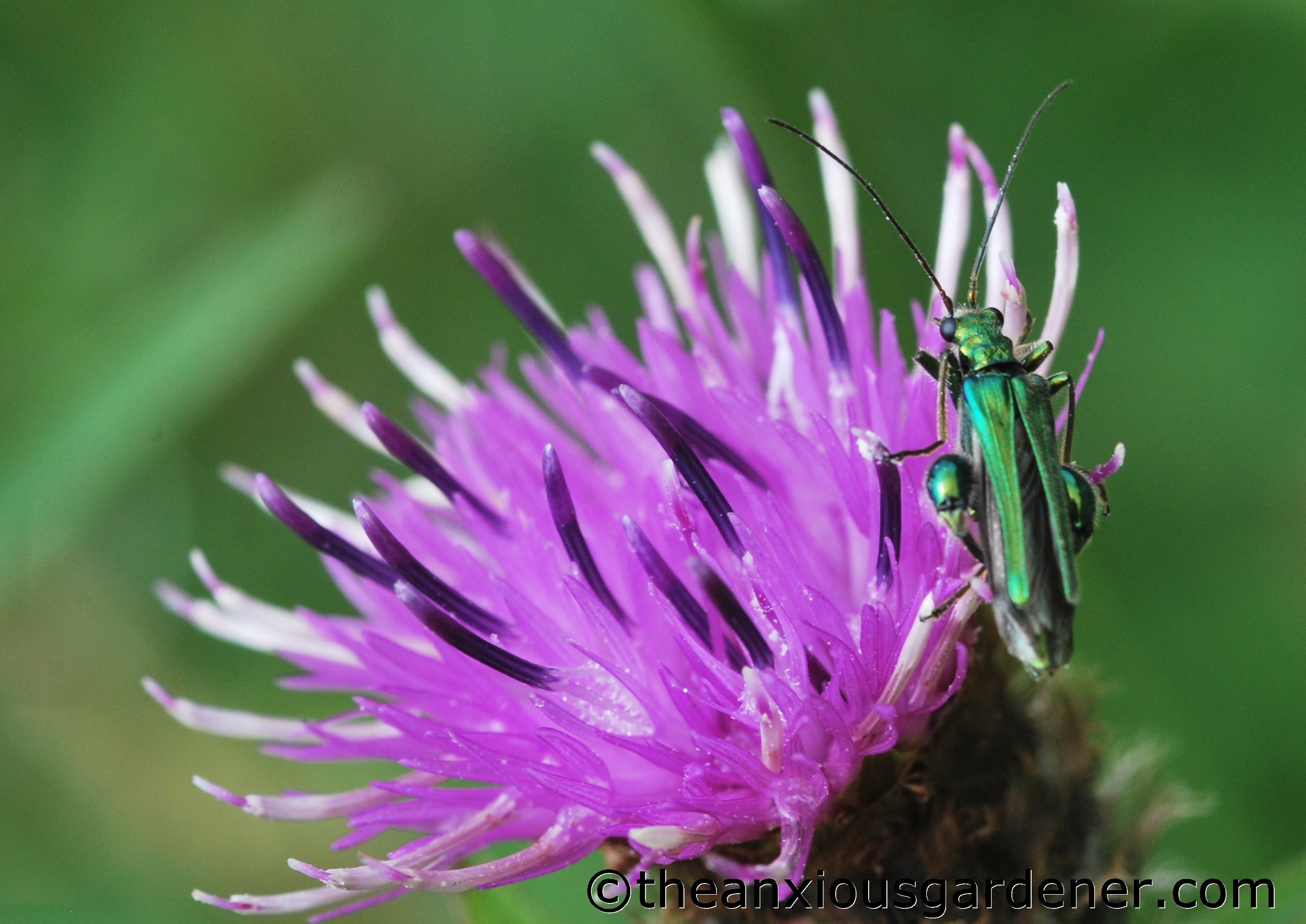 Lovely post. I’m a great fan of Knapweeds. I love the Centuarea family in general. I may look at trying to get some seed and introduce the knapweed to the garden. It has been a dreadful year so far for butterflies. I’m starting to see a few more over the last few days fluttering around but I’m sure the weather will have had a negative impact on their huge which are already declining. I thought exactly the same about the burnet moth. Spotted one a few years ago at a local nature reserve and thought we’d discovered some rare beauty. We then turned the corner and they were everywhere you looked. They’re are stunning though. The colour is incredible on the thick legged beetle, shame about the name. Wonder if they’re jealous of demoiselles, ladybirds and butterflies with their pretty names when he’s left with a name that makes him sound like he needs to go on a diet?