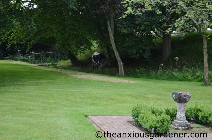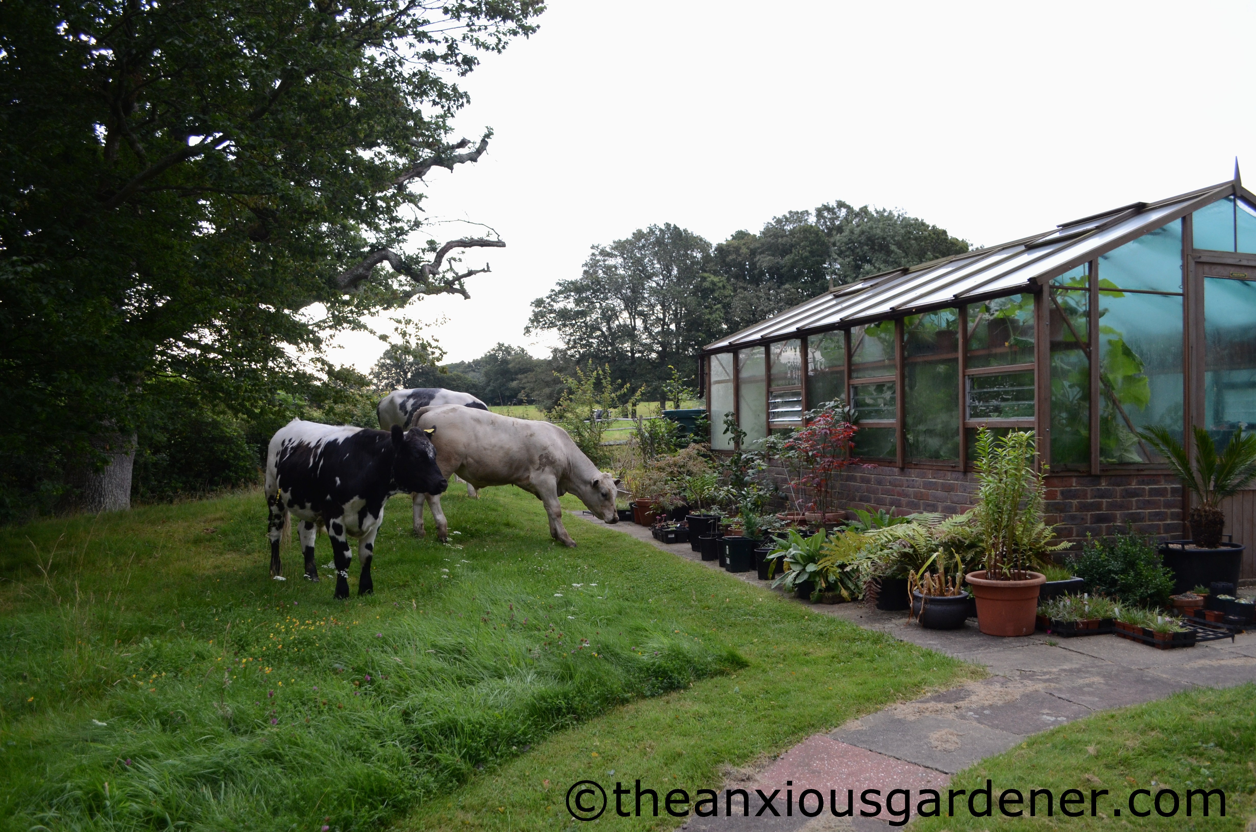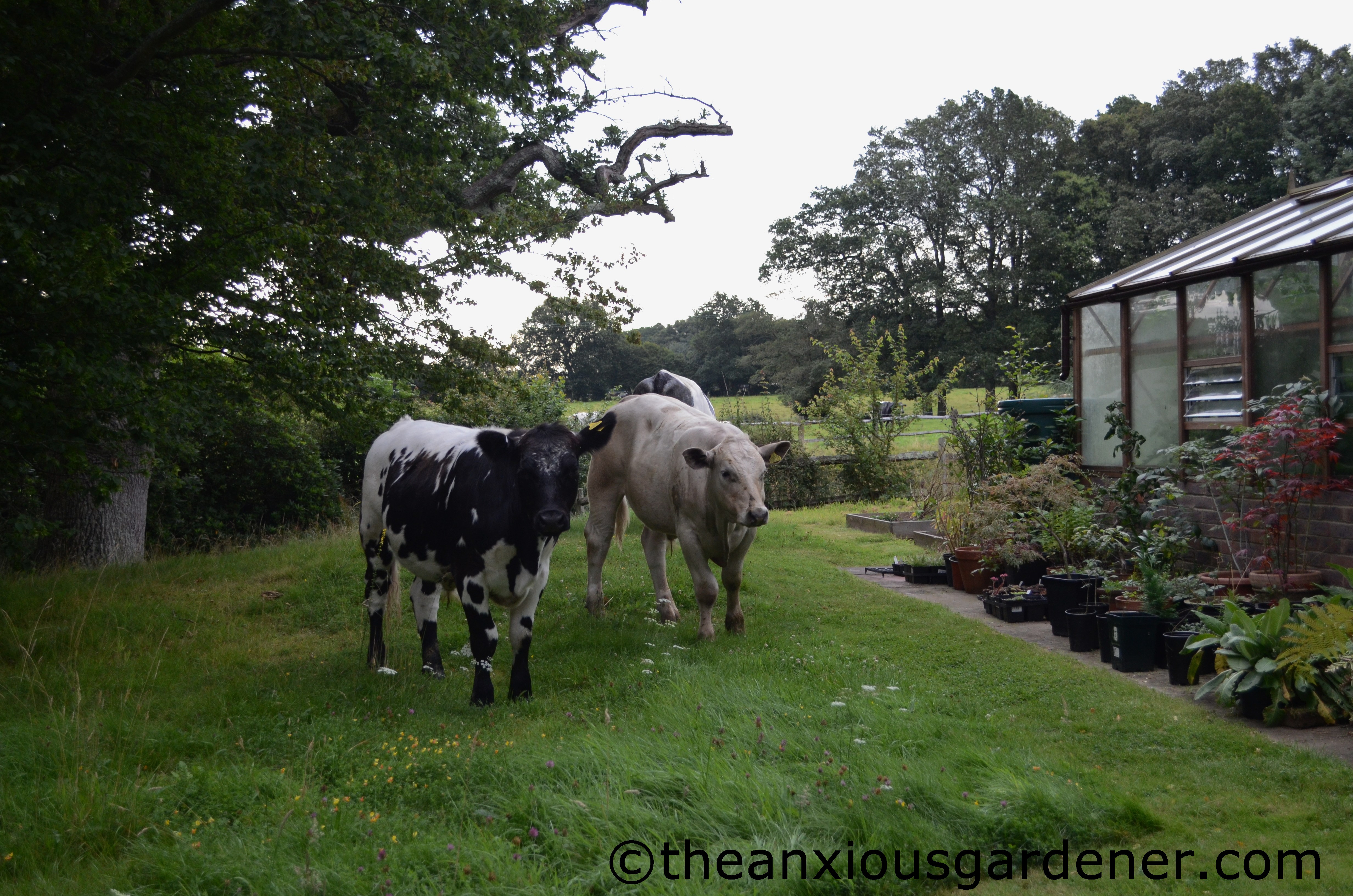 Pink-dressing-gown-clad help arrived from the house, having seen a cow trot past the kitchen window.  Together we headed them off from the kidney beds, screamed when they approached the veg beds and hurled abuse as they veered off toward the long borders.   We ordered them out through the gate and onto the drive – only to be stared back at: silently, curiously, ignored.  By luck alone, we managed eventually to coerce them back up towards the greenhouse.