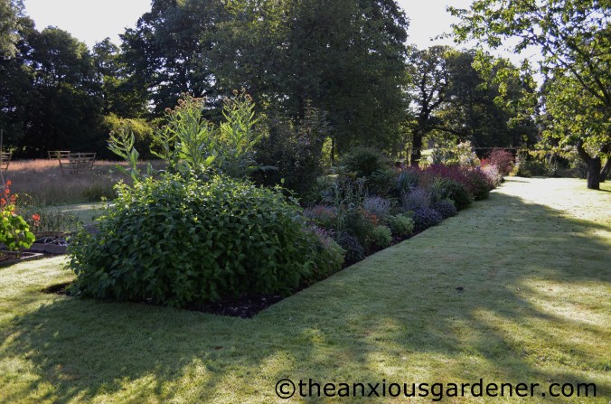 The kidney beds with absurdly huge (and very stoutly staked) echinops – left, have put on a good showing this year. Over on the right, behind the persicaria is …