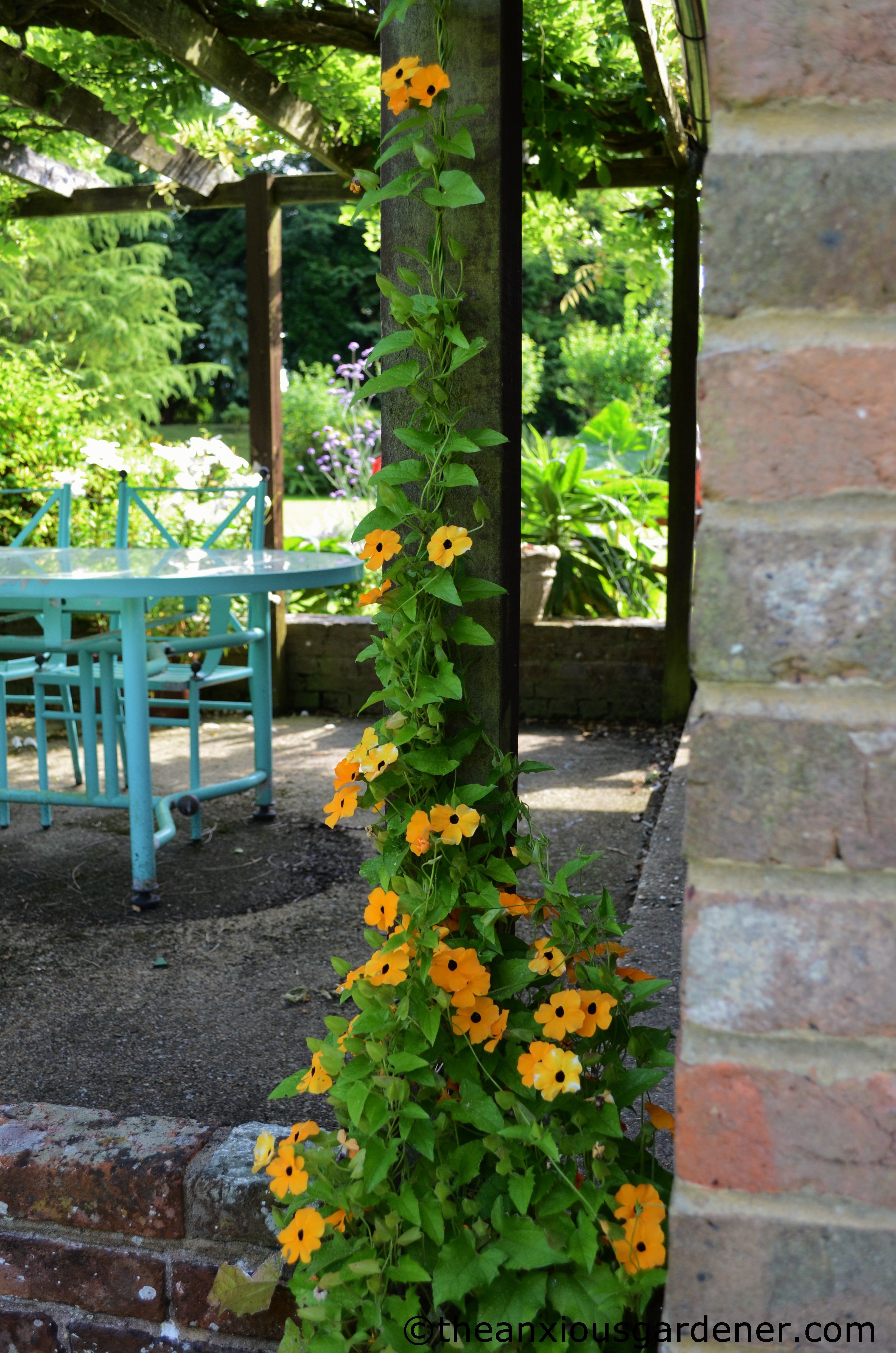 For these past four years, I’ve experimented with different climbers on this wooden post: morning glory, passion flower, Spanish flag and this year black-eyed Susan (Thunbergia alata). I can now announce my climber trial is over and we have a clear winner. Of the four, I am most impressed with (…drumroll … bugle … more drumroll … a touch more bugle …) the Thunbergia. It has won itself a permanent spot. *Applause, whistles and foot stomping*