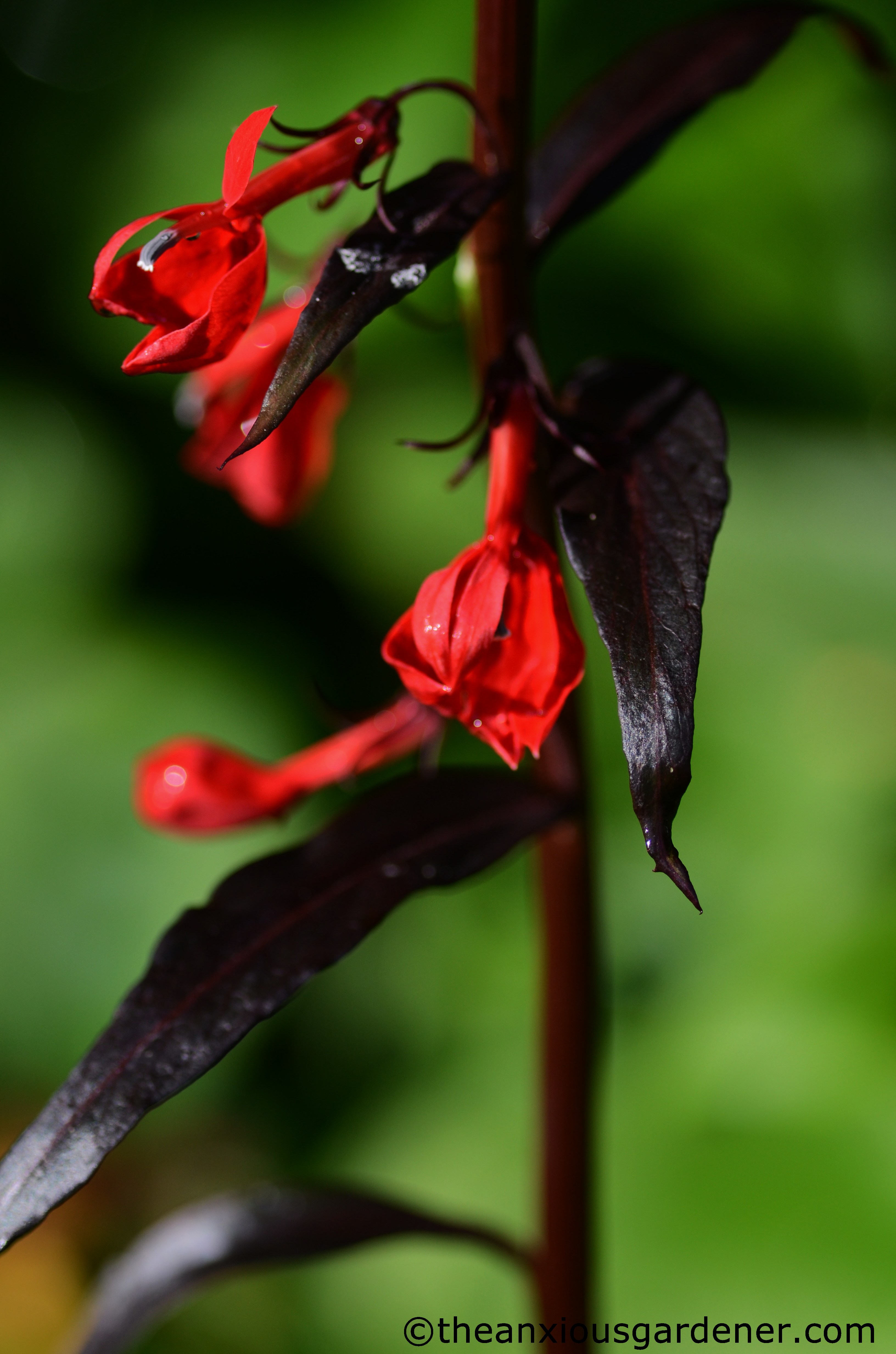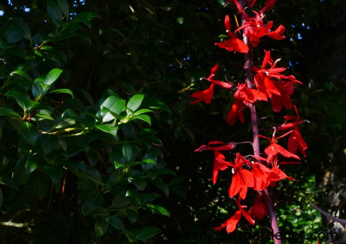 Here, in the rock border, is Lobelia cardinalis ‘Queen Victoria.‘ I’ve grown this in my garden before but this is its first year at the Priory.