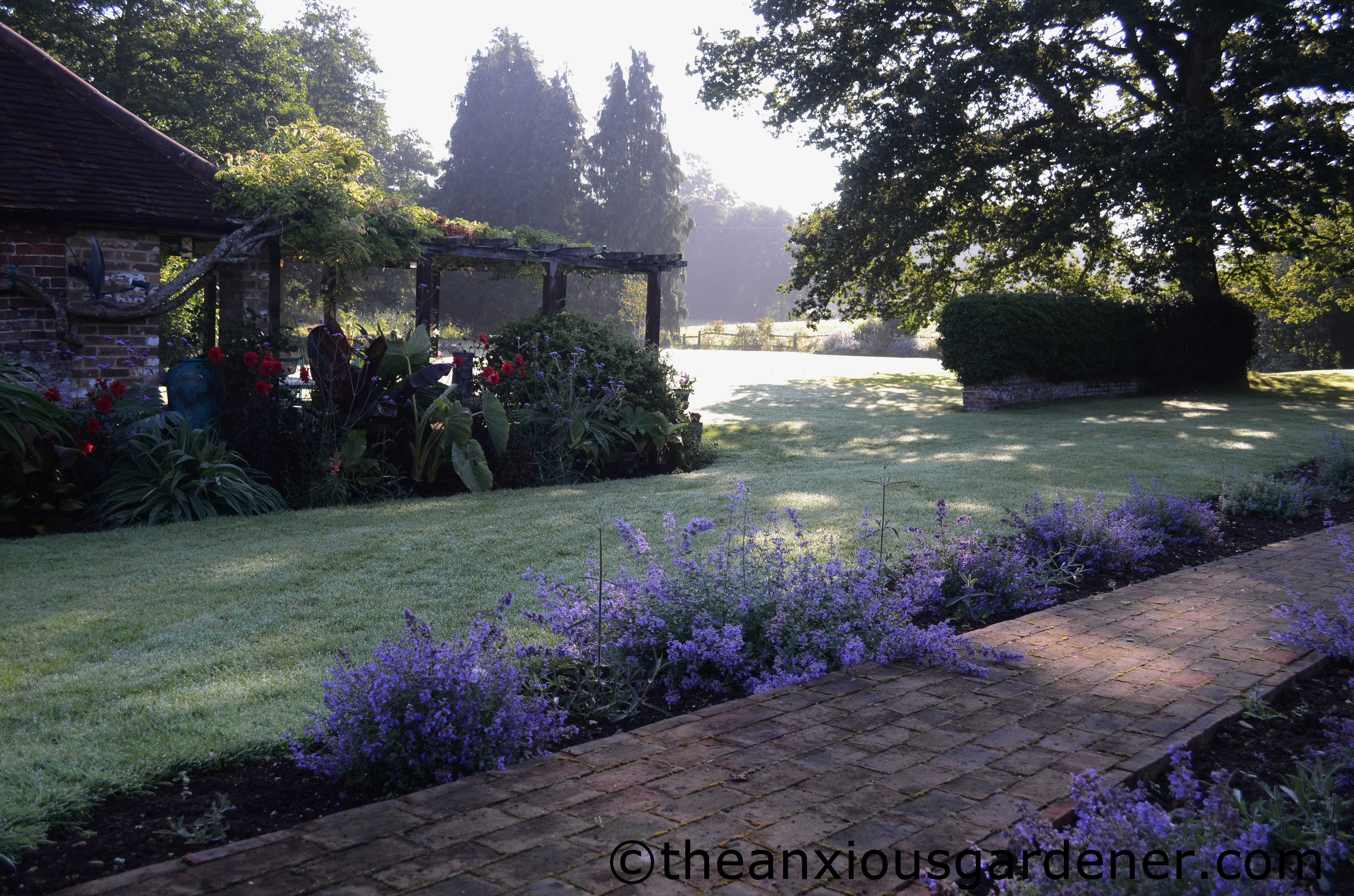 A view across the new path beds (planted with but not yet filled by Nepeta ‘Six Hills Giant’) to the new tropical border.
