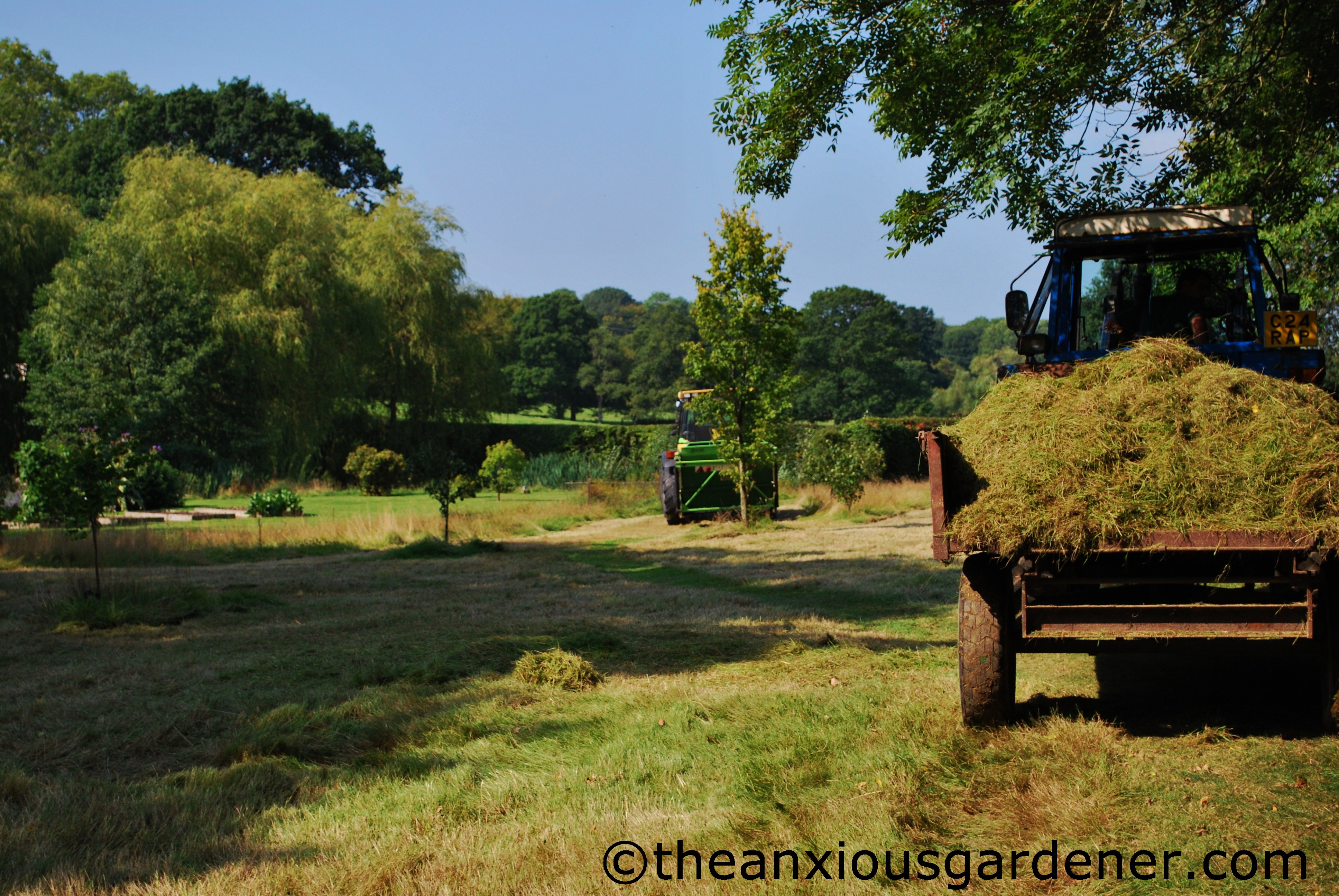 Of course, I still had a problem: what on Earth to do with mountains and mountains of mown grass. Unfortunately, I had no alternative other than to dump them at one end of the meadow. Historically, this is one of the places where my predecessors piled lawn clippings. I would rather have taken them out to the bonfire site and/or compost bins but this would’ve meant repeated driving across soggy, boggy lawns. And this year, that was a mud-churning and lawn-destroying no-no.