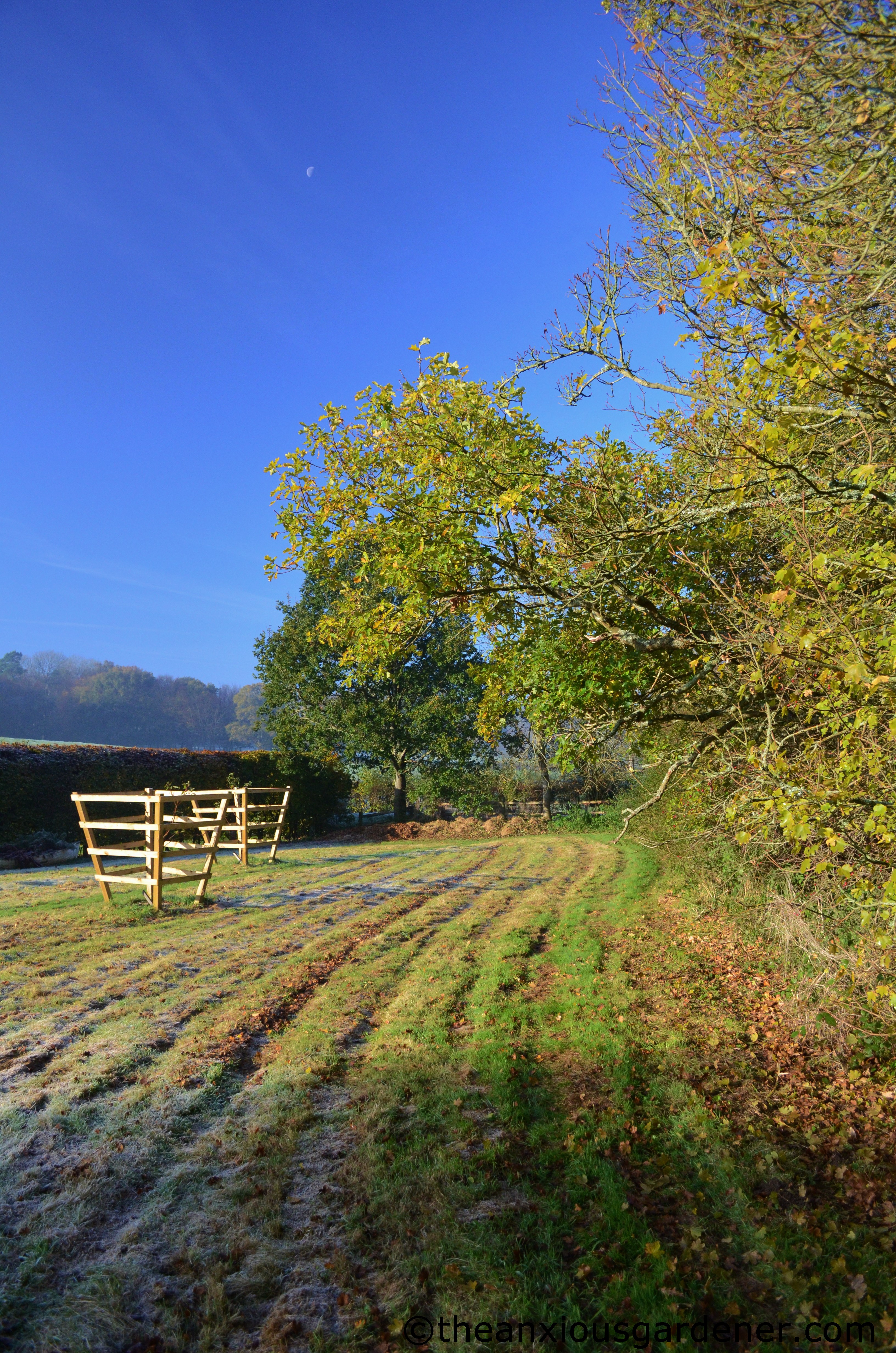 And so the cuttings will just have to sit beneath that oak tree. Can you see them? (And the moon)? In time a bank of nettles will grow over them and within a couple of years the heap will have rotted away to virtually nothing. Honest it will. But it is an unsightly solution and not one I want to repeat. (You can see in this photo how soft the ground is. Even the Atilla and the ride-on mower have left shallow tyre runnels).