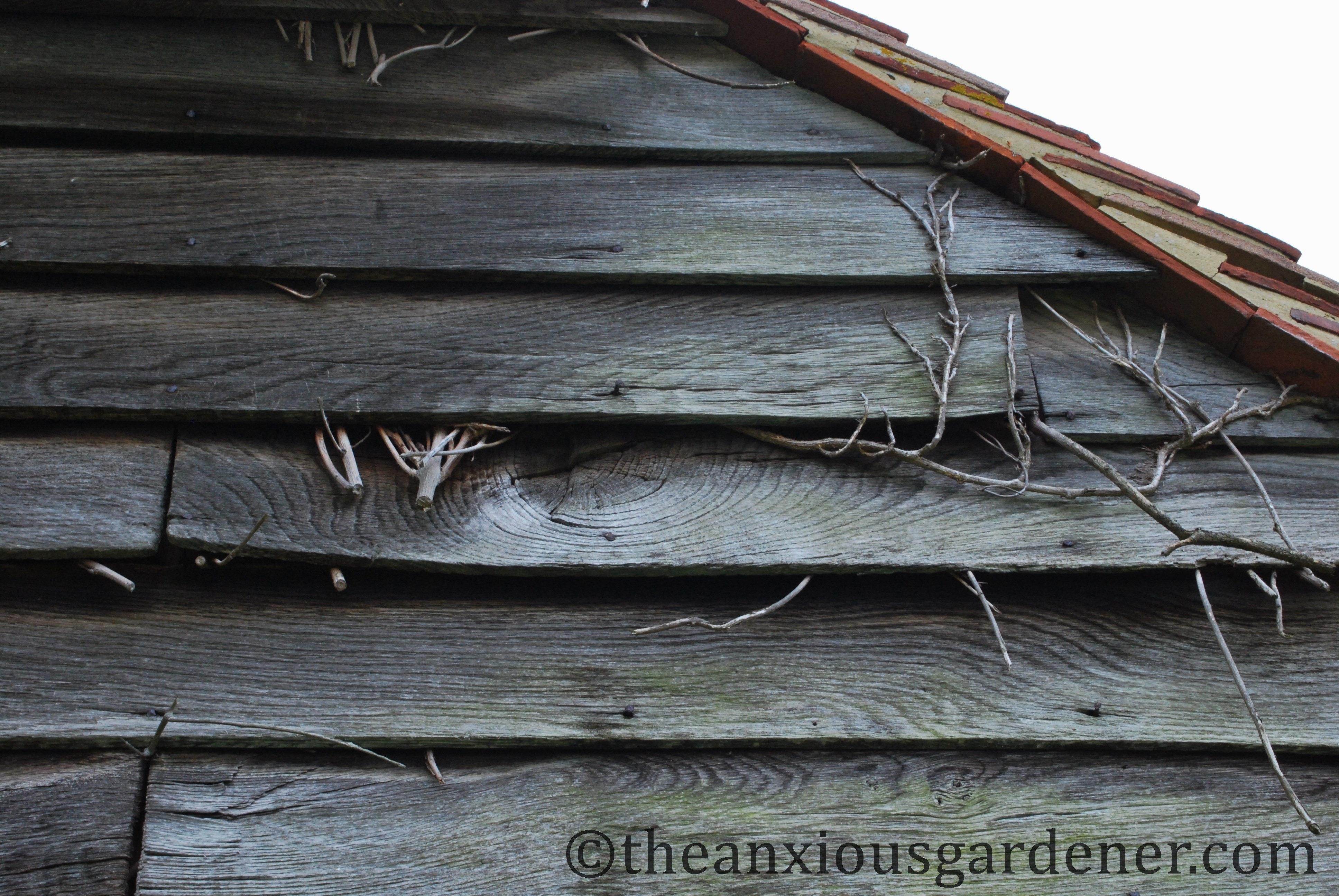 And this. Left untended, it had run amok into the clapboarding and roof of another outbuilding. Its reward? Pruned right down to the base by my predecessor. With a chainsaw. Didn’t die though. I noticed new shoots appearing from below ground and so over the years, I have trained it along wire supports to cover a rather unsightly block wall.