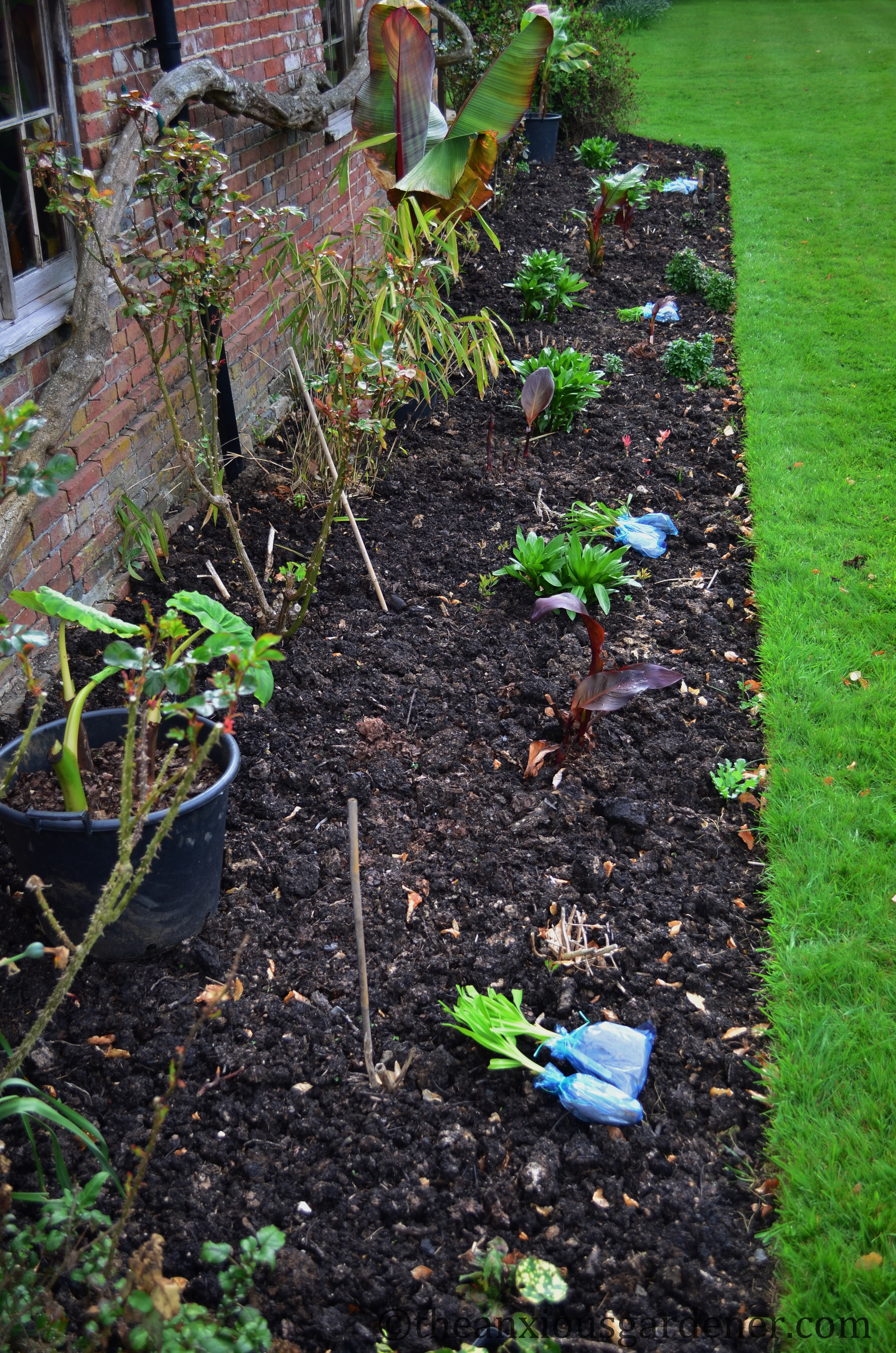 Last autumn, I either left Musa basjoo to be killed back to ground level by cold or carted them off to the greenhouse. This year I shall leave them be but protect the stems against frost and have much taller plants next year.