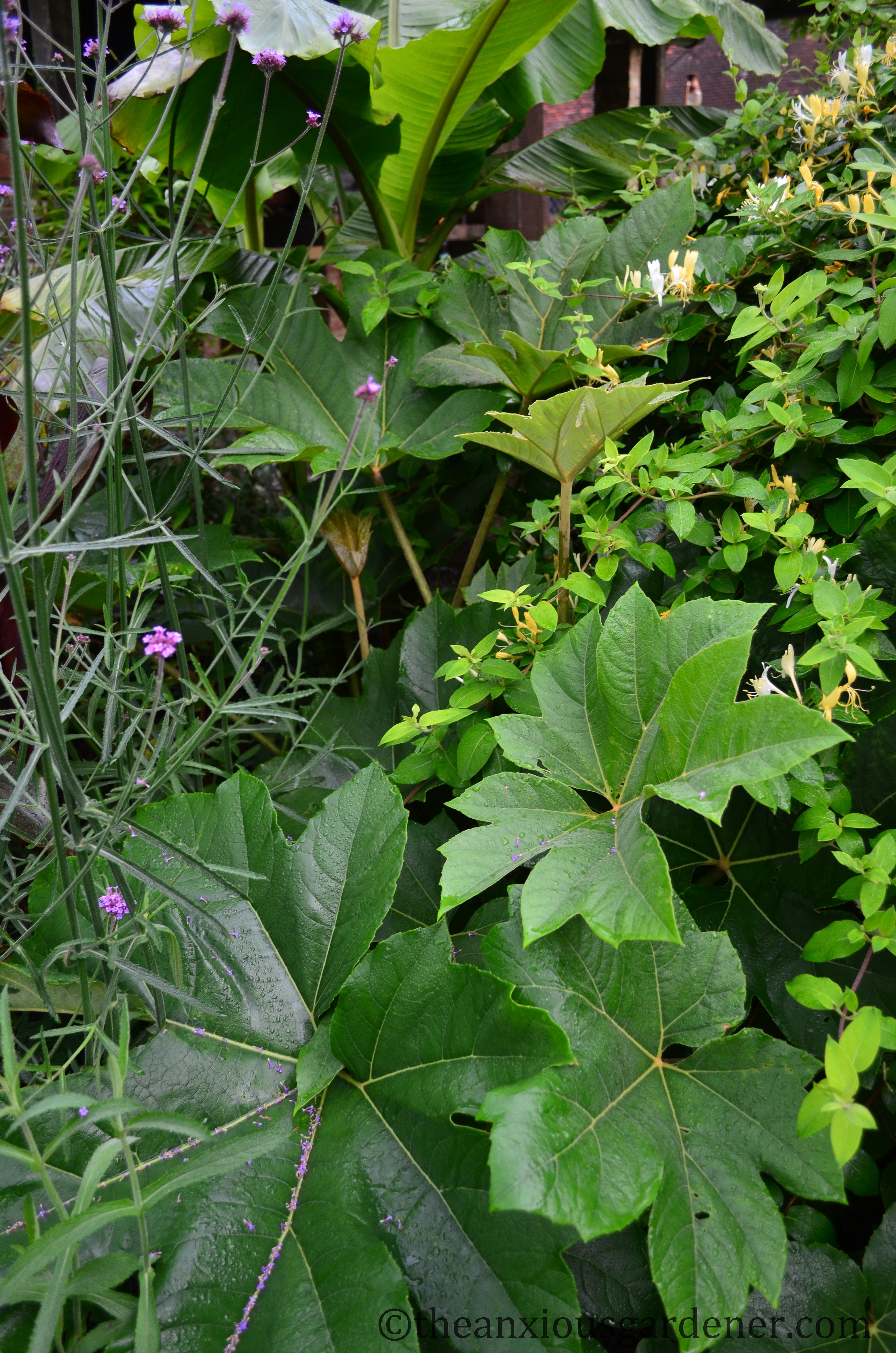 Tetrapanax papyrifer ‘Rex’ is producing large palmate leaves and sending out lots of suckers but its impact is possibly lost against a mound of honeysuckle. I did consider removing the latter but the scent is so strong it embraces most of the bed.