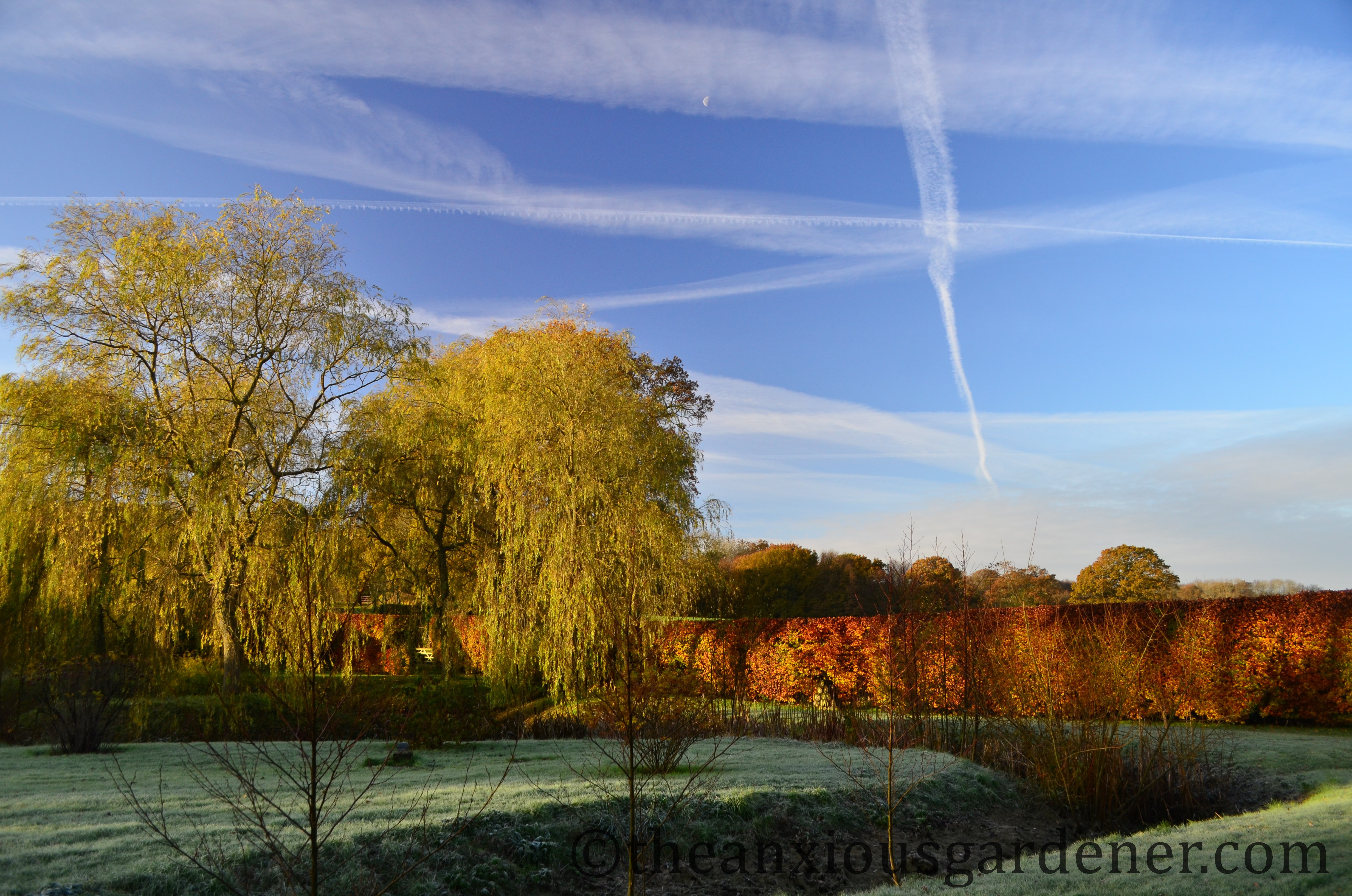 though the leaves of the weeping willow won’t be rushed. (Excuse two very similar photos but I liked the dissipating vapour trails and tiny, day-time moon).
