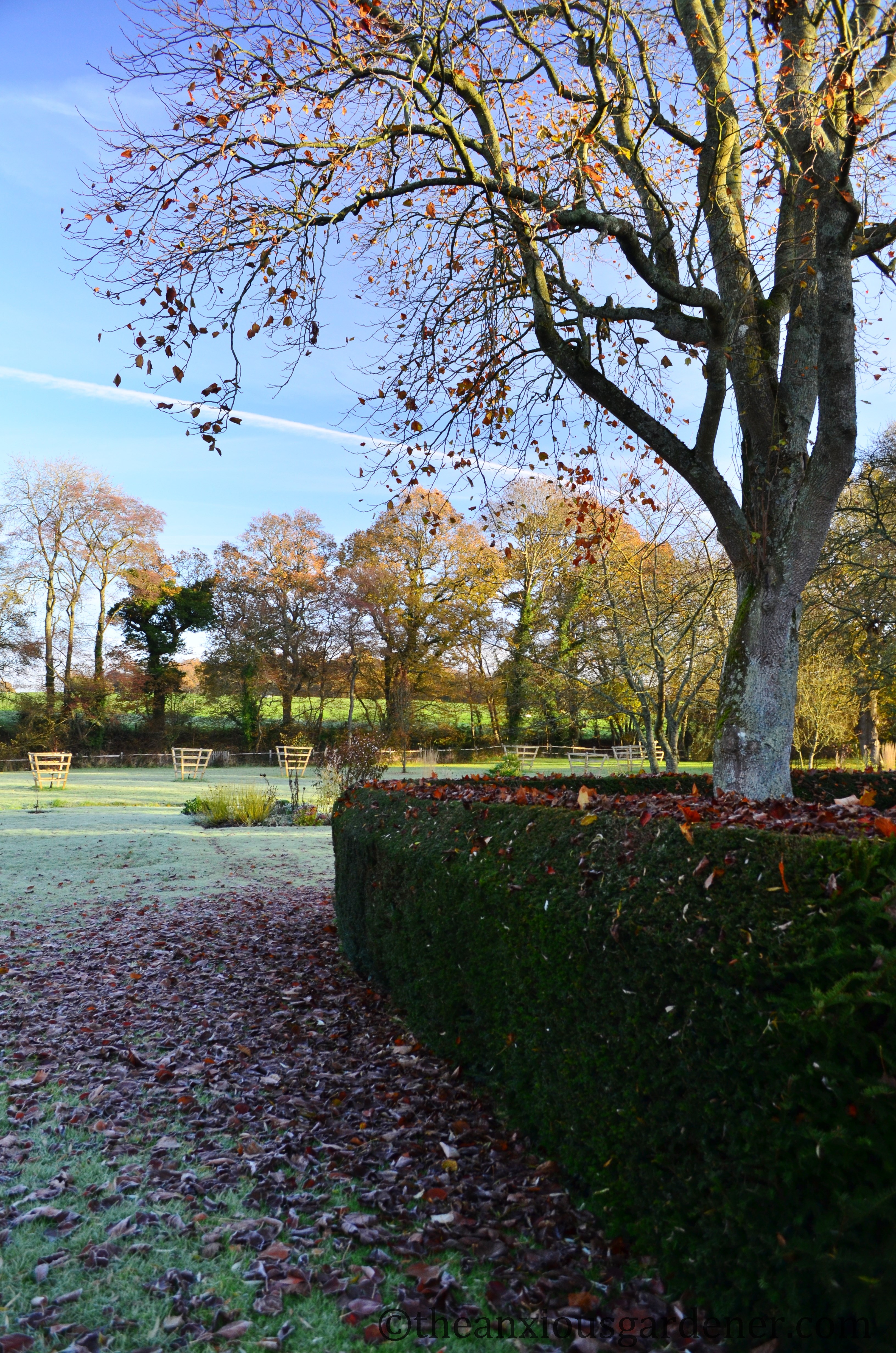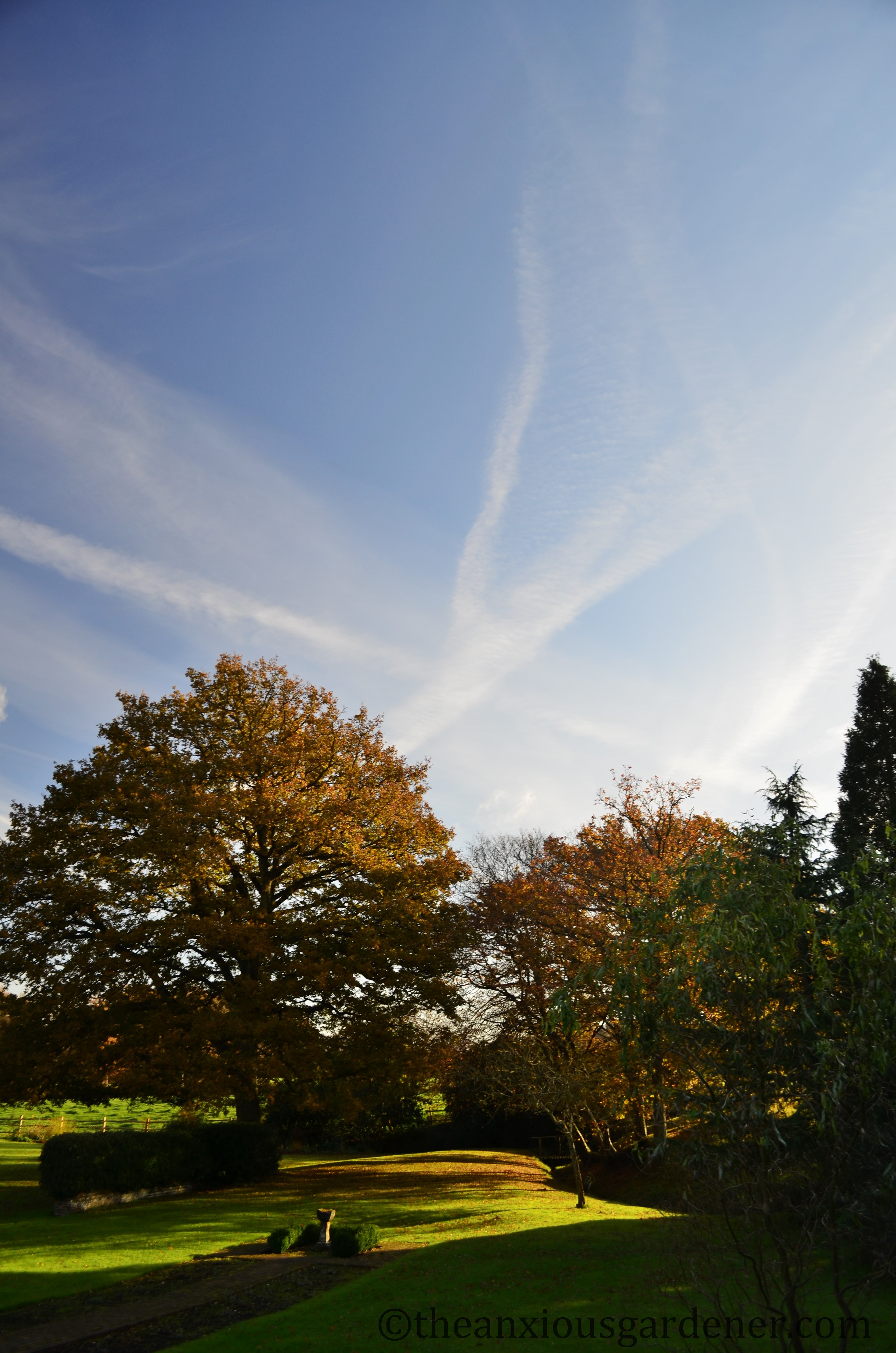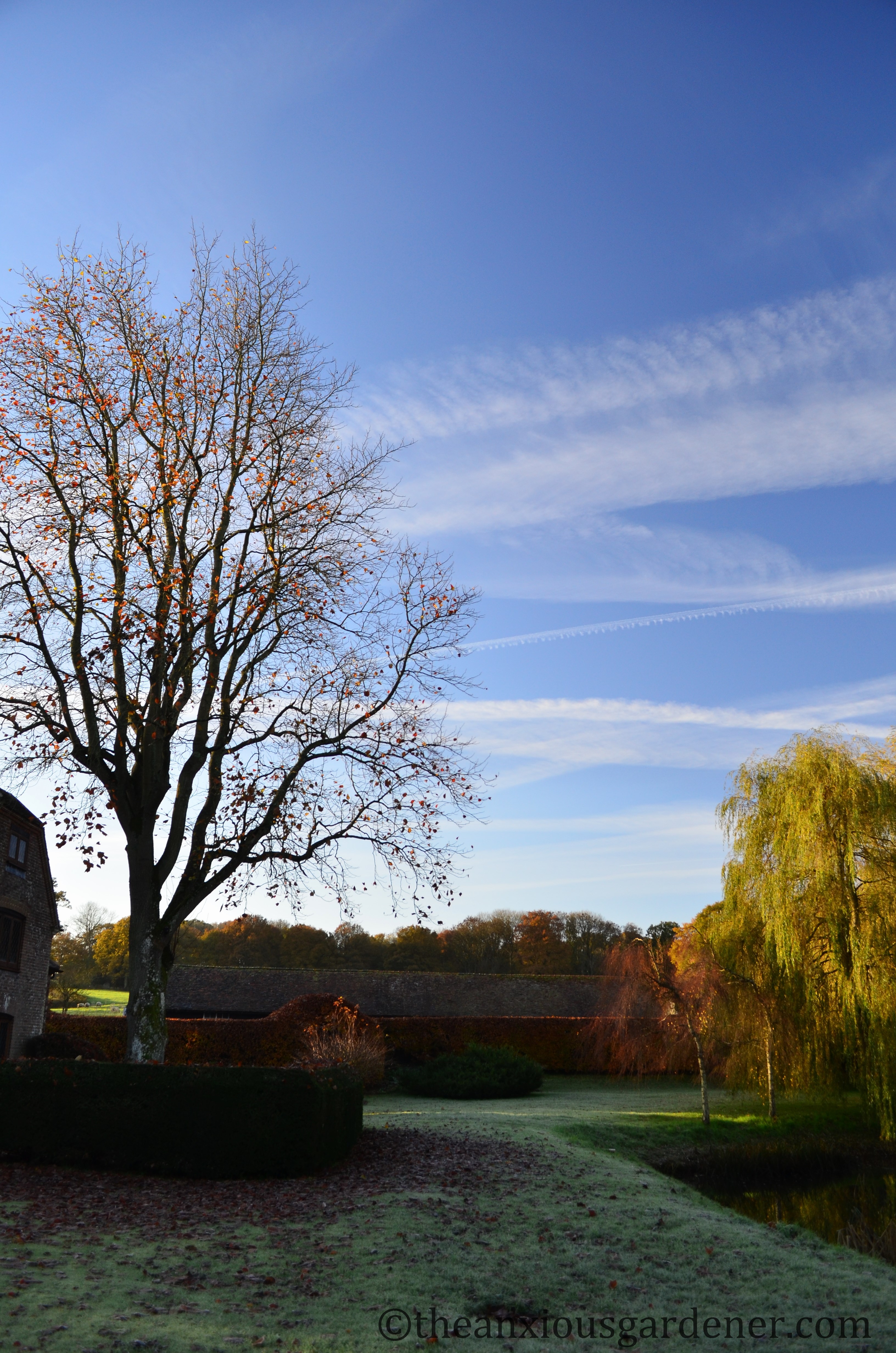 I can think of worse ways to spend a sunny day than raking leaves in such a beautiul environment, but after your brush with civilisation it must be a bit of an adjustment. I love the contrast between the weeping willows and the burnished beech hedge, really beautiful. Such a shame you can’t collect in the comfort of a ride-on mucnhing machine though, despite the noise. Am glad you included the vapour trail and incy wincy moon. I really must inspect my leadf mould, I suspect it too could benefit from another year, or at least a few months.