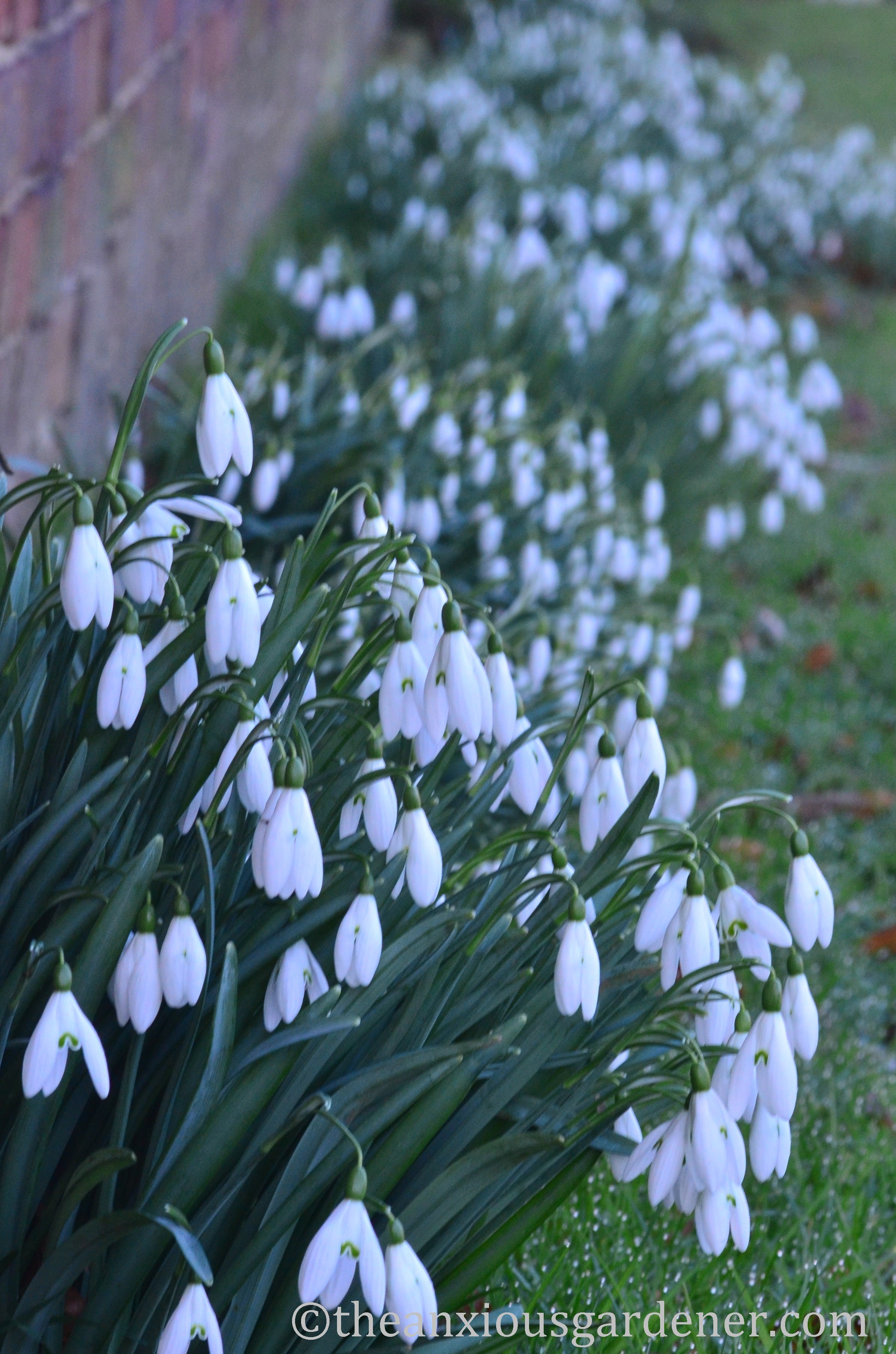 The Priory did boast some snowdrops (before me) but not very many.  I have added more to this long, extended clump along the base of an outbuilding.
