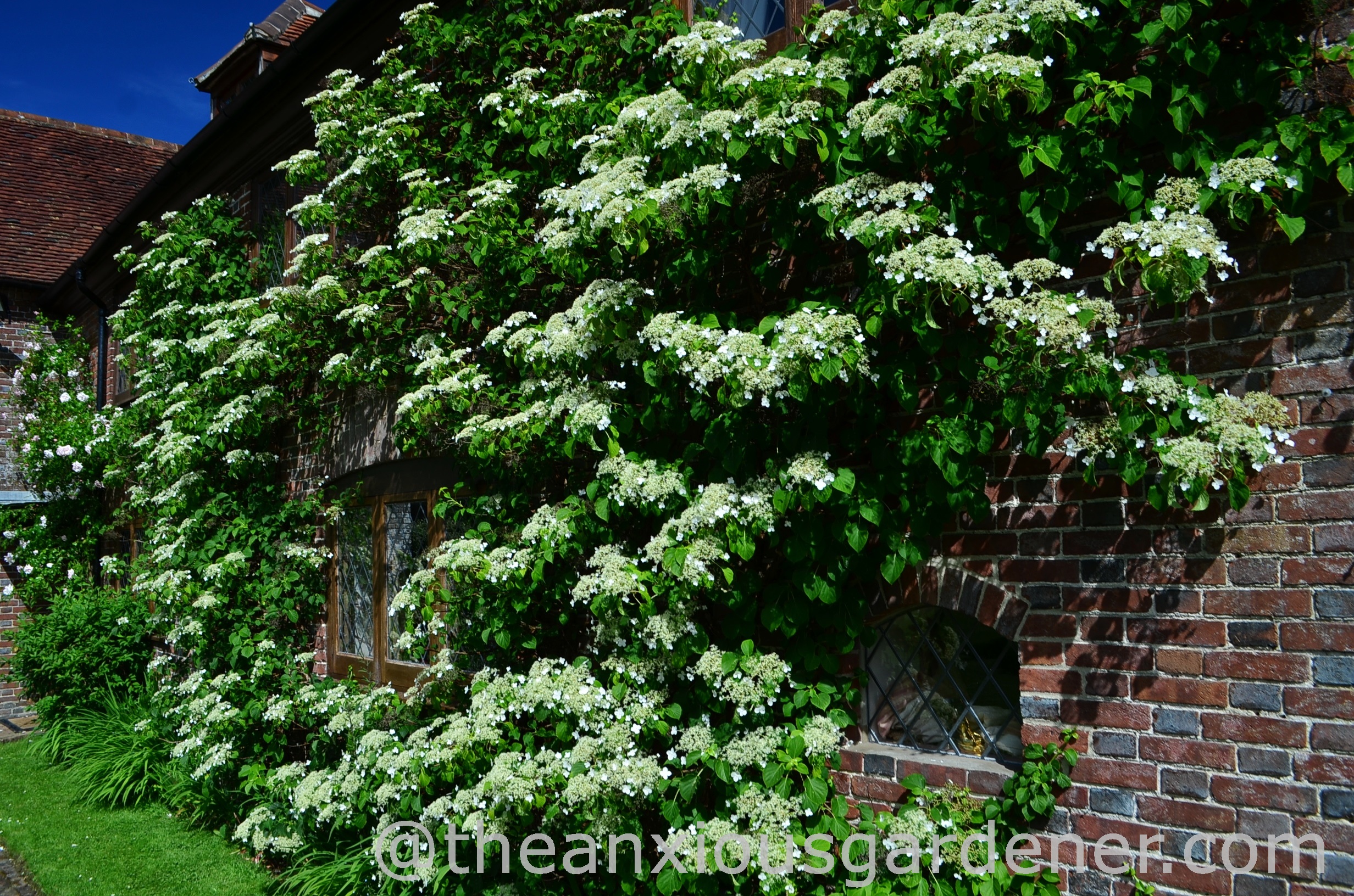 Some plants in the garden don’t need much attention; the Hydrangea petiolaris on the front wall of the house for example. I deadhead it (a little), cut growth creeping over windows and into the roof but otherwise leave it to its own slow devices.