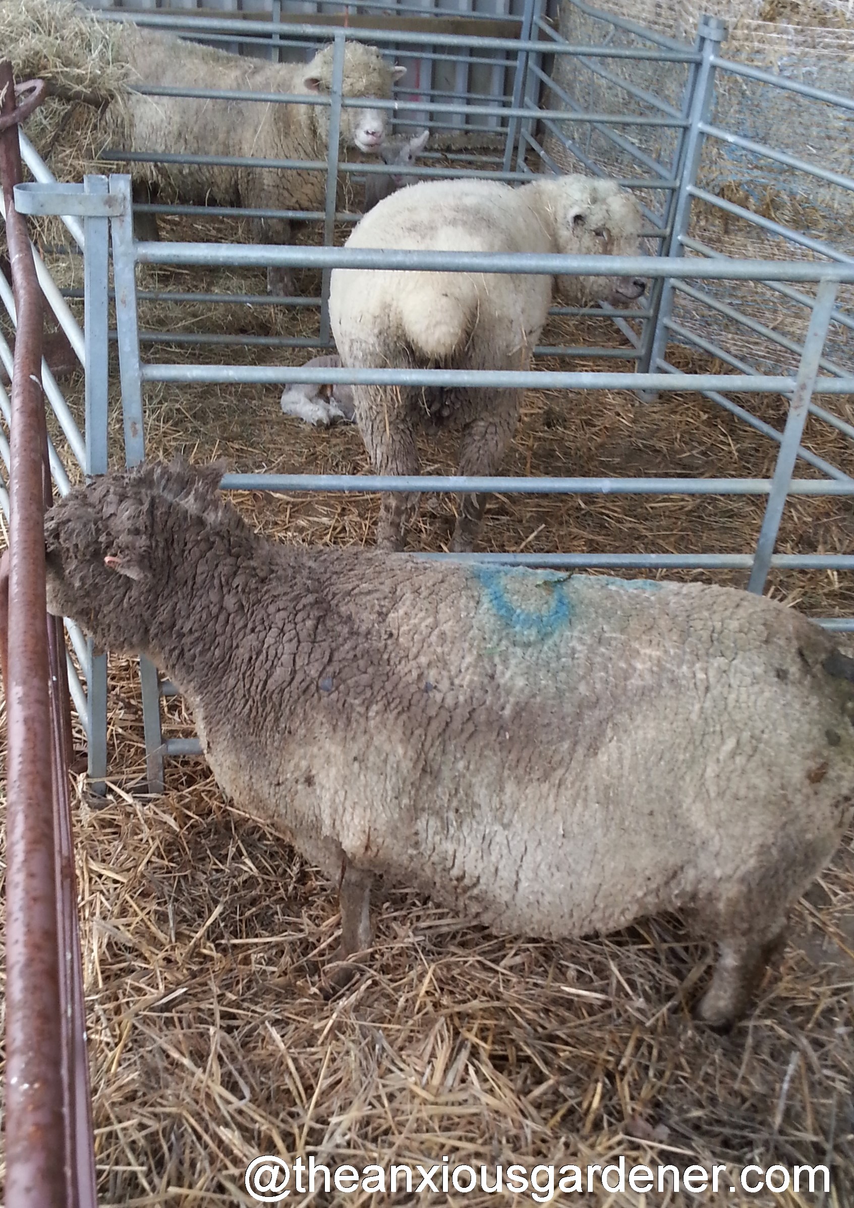 The barn was warm and dry and the ewe had other lambing mothers for company. A quick glance at her rear end and it was clear – even to me – that she would lamb imminently; perhaps induced by her misadventures. I just hoped I hadn’t squeezed her too tightly between my knees. (Which incidentally is the first time I’ve ever harboured that particular worry about anyone).