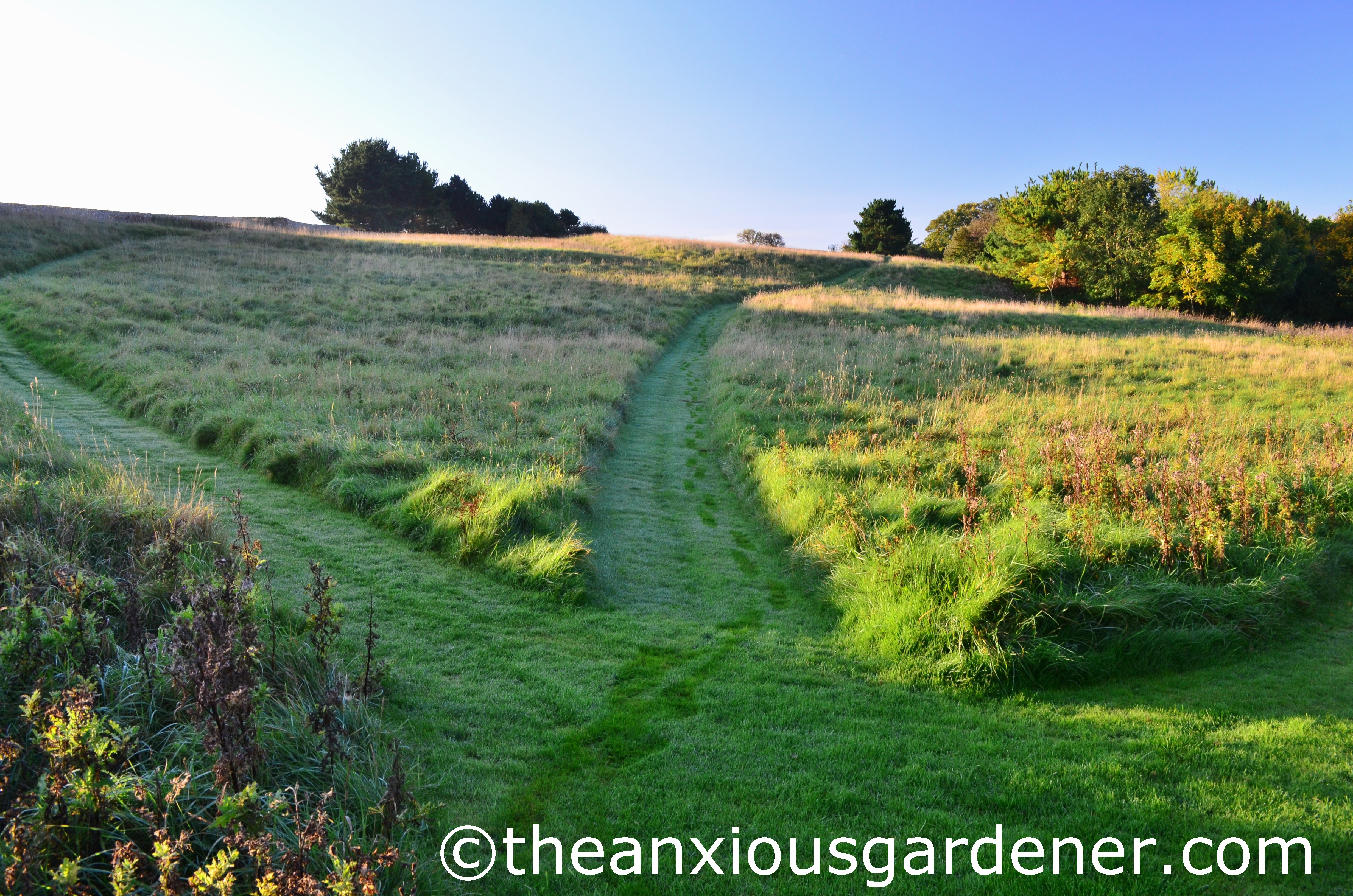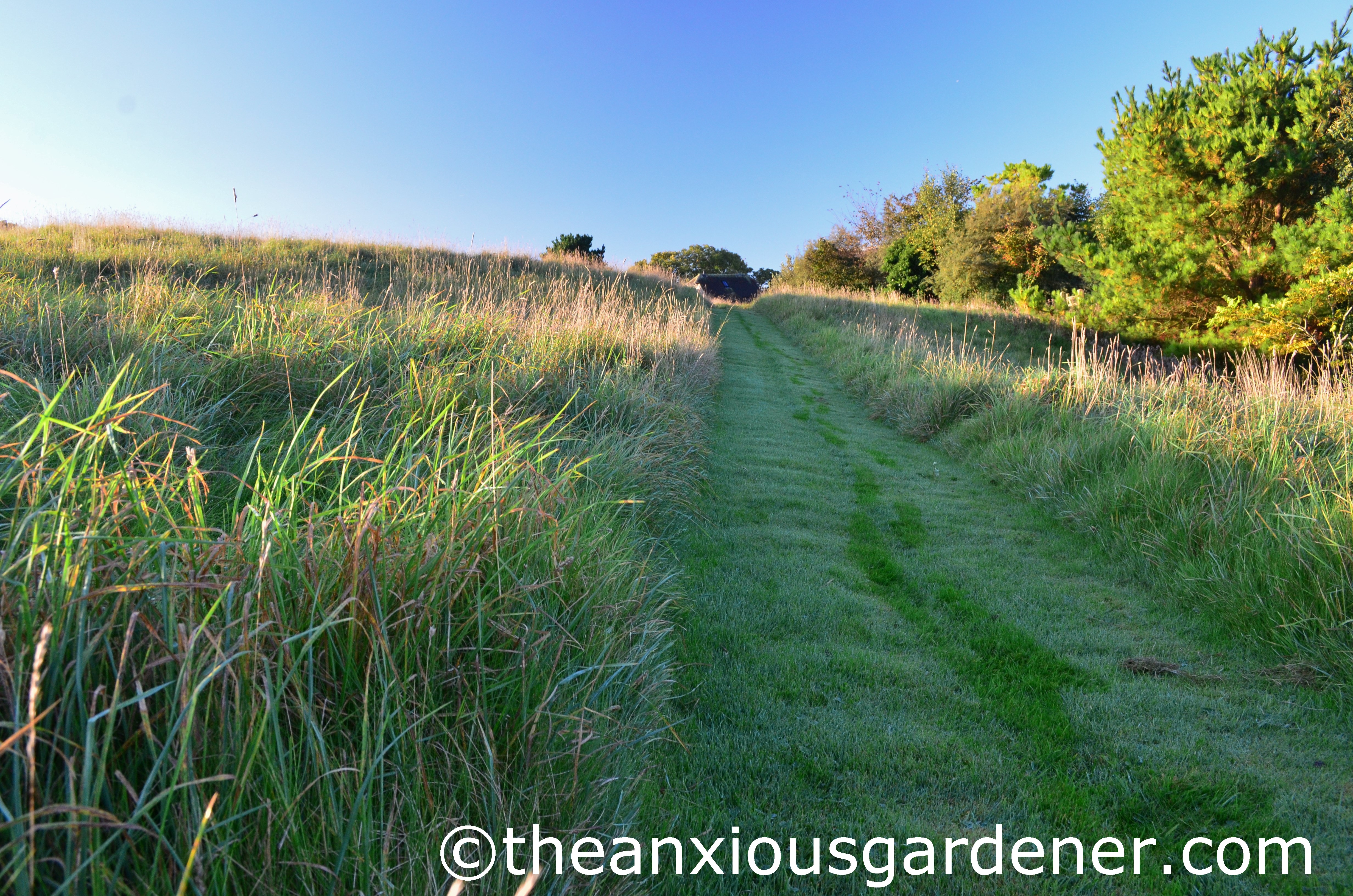 My only true concern when chopping this long, tough grass is avoiding the fleeing field-mice and scuttering voles. I need to be vigilant to avoid mowing a vole. Who wants that?