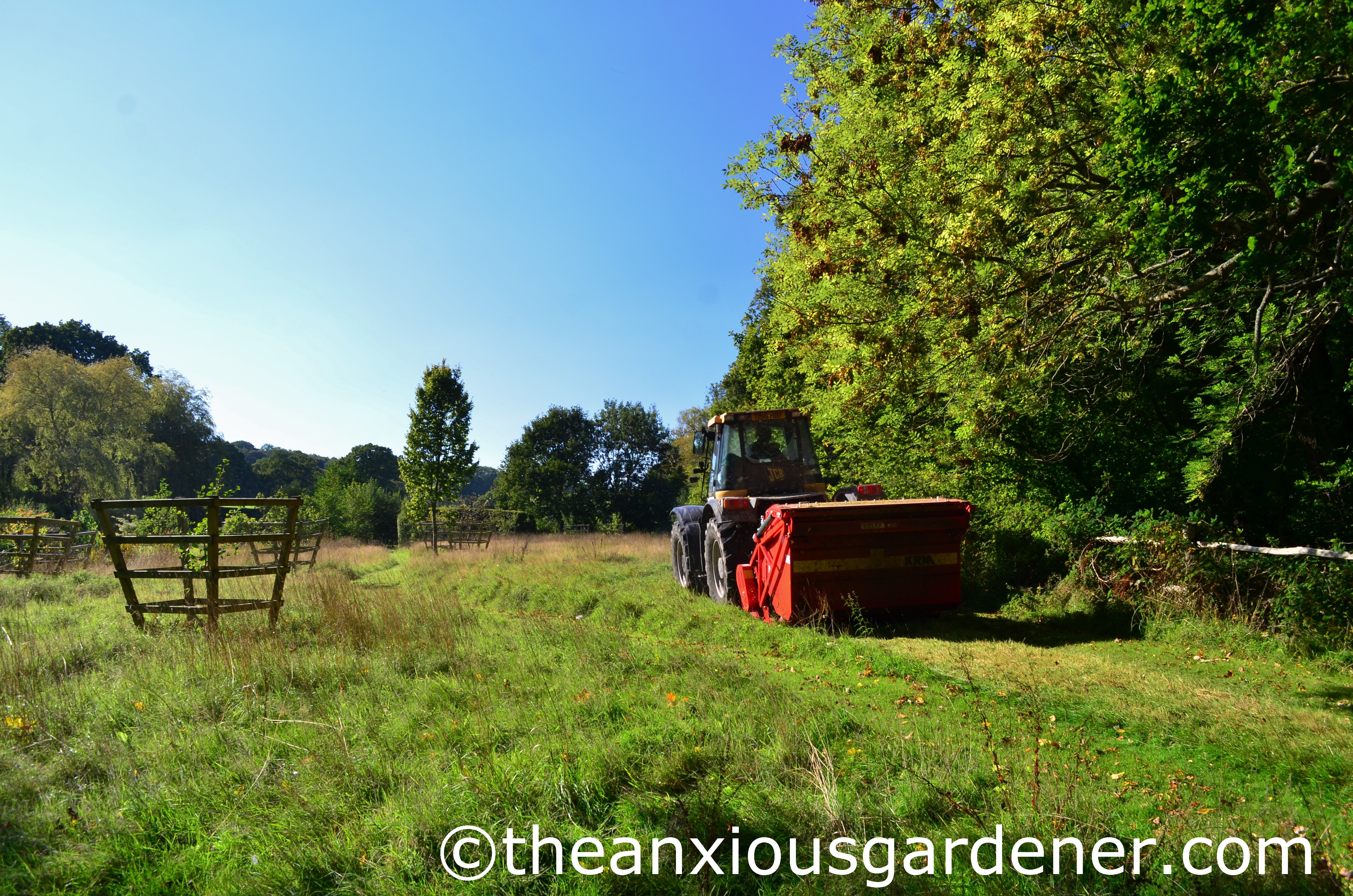 The following morning the meadow was stripped bare. But the job wasn’t quite done. I spent about a day tidying up: strimming all the bits Sam couldn’t reach and cutting the grass shorter still with The Priory ride-on.