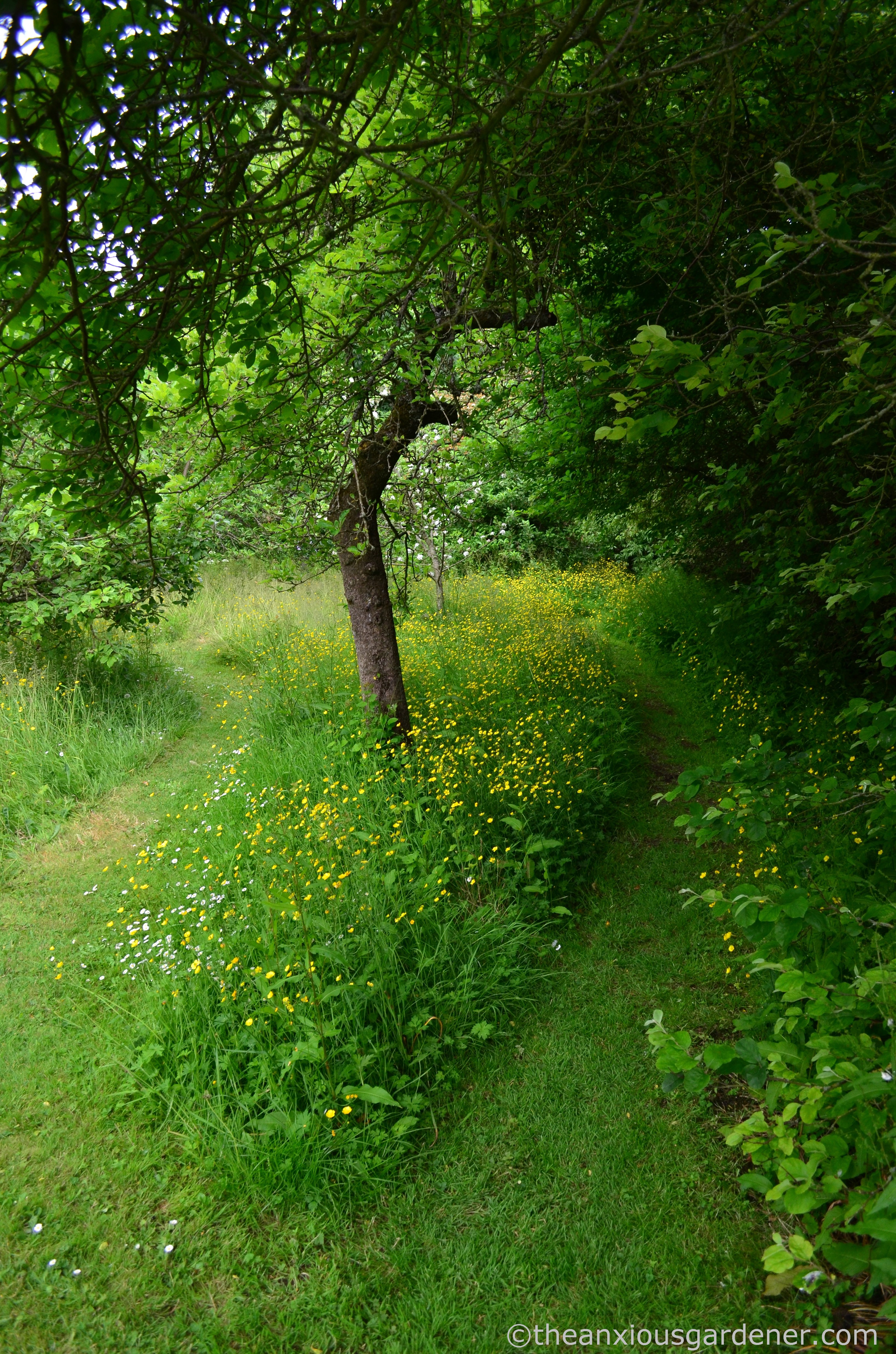 Mowing paths through the long grass makes a feature of what is, after all, unkempt lawn. More close sward or buttercups and daisies? I know which I prefer.