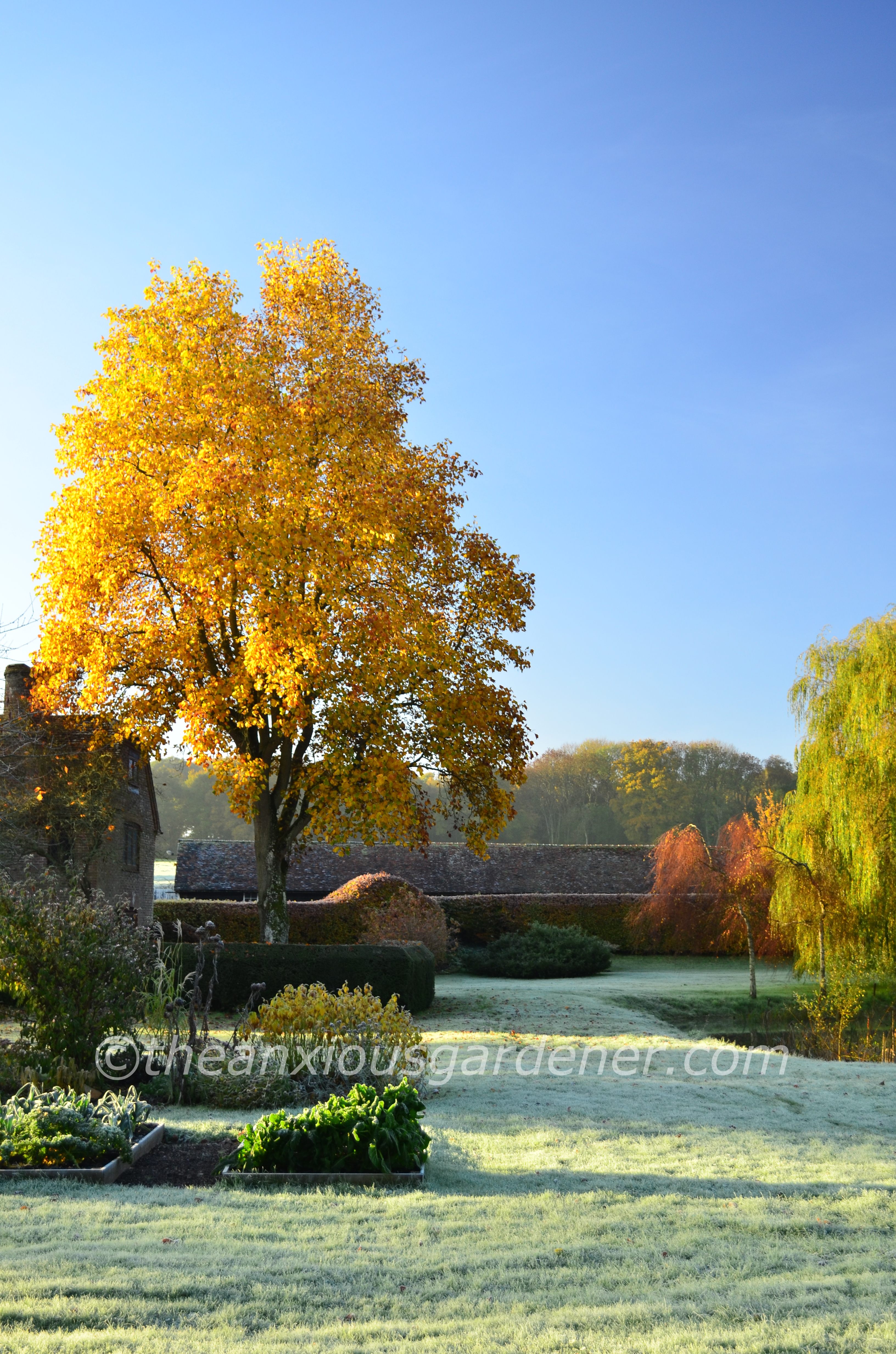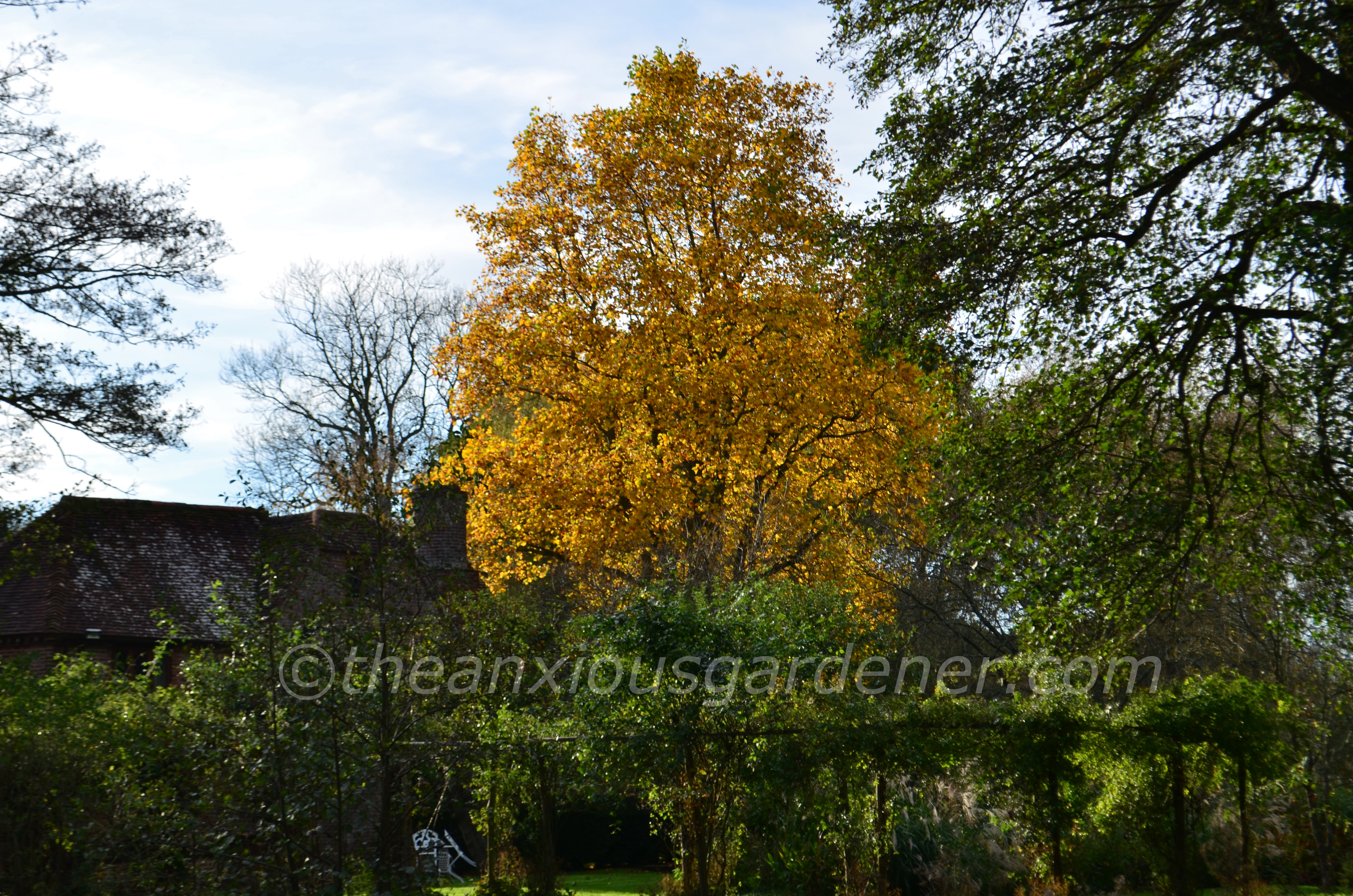 For a short while, it is the garden’s signature tree. For most of the year it holds either naked branches against sky; or else a wrap of unremarkable green – like so many other large trees at The Priory. It isn’t quite the biggest tree and it isn’t quite my favourite. But for a few days in autumn, it is the signature tree. To me.