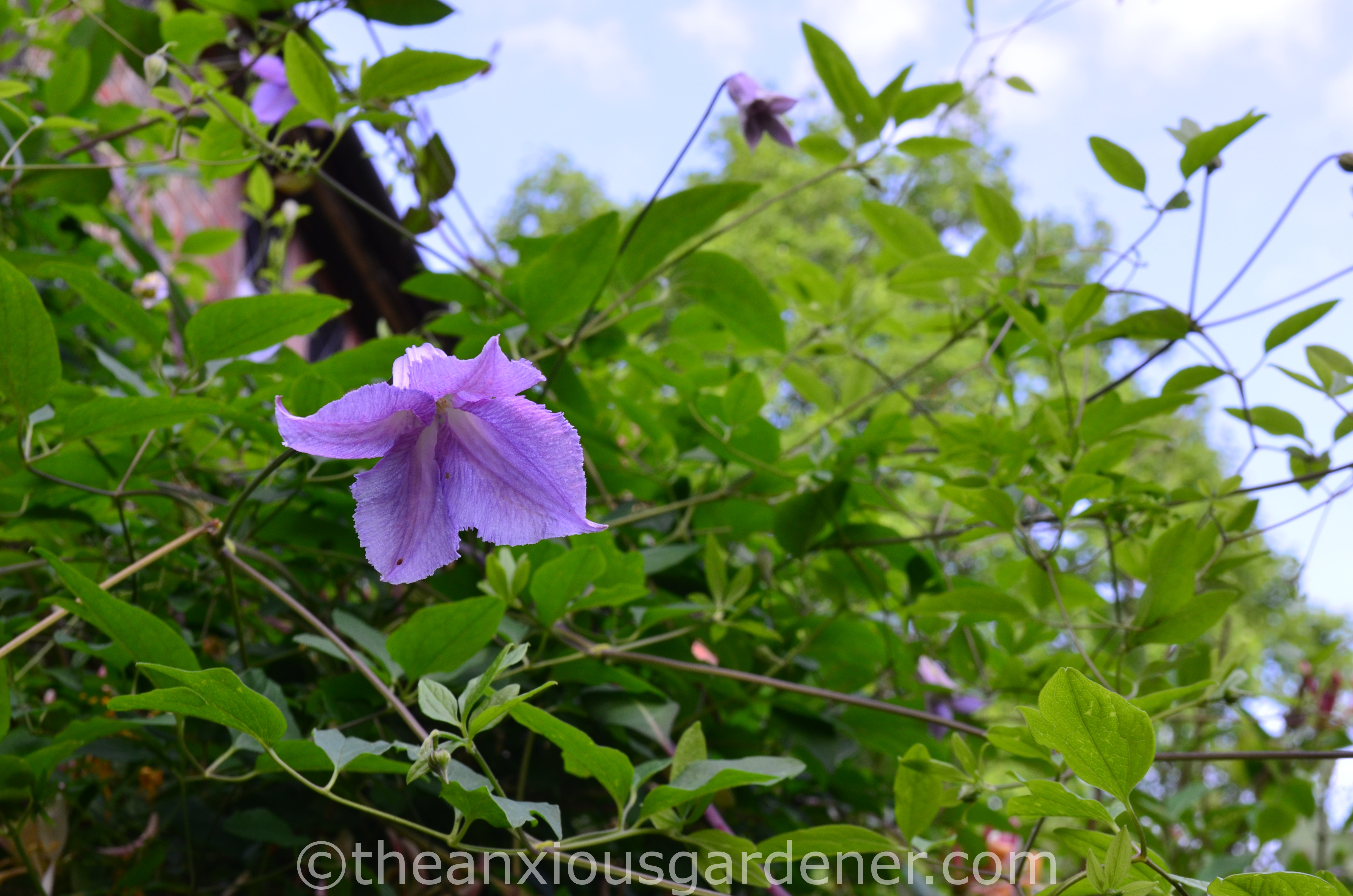 I keep its roots well shaded (clematis don’t like their roots sun baked) and tuck in shoots that otherwise wave around in the air.
